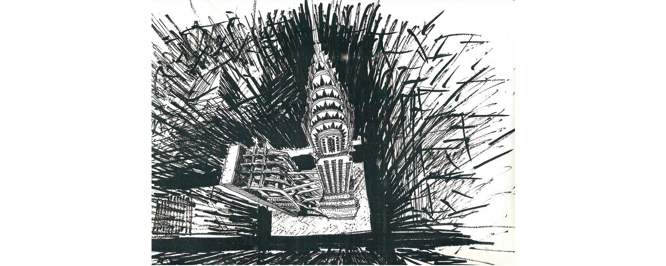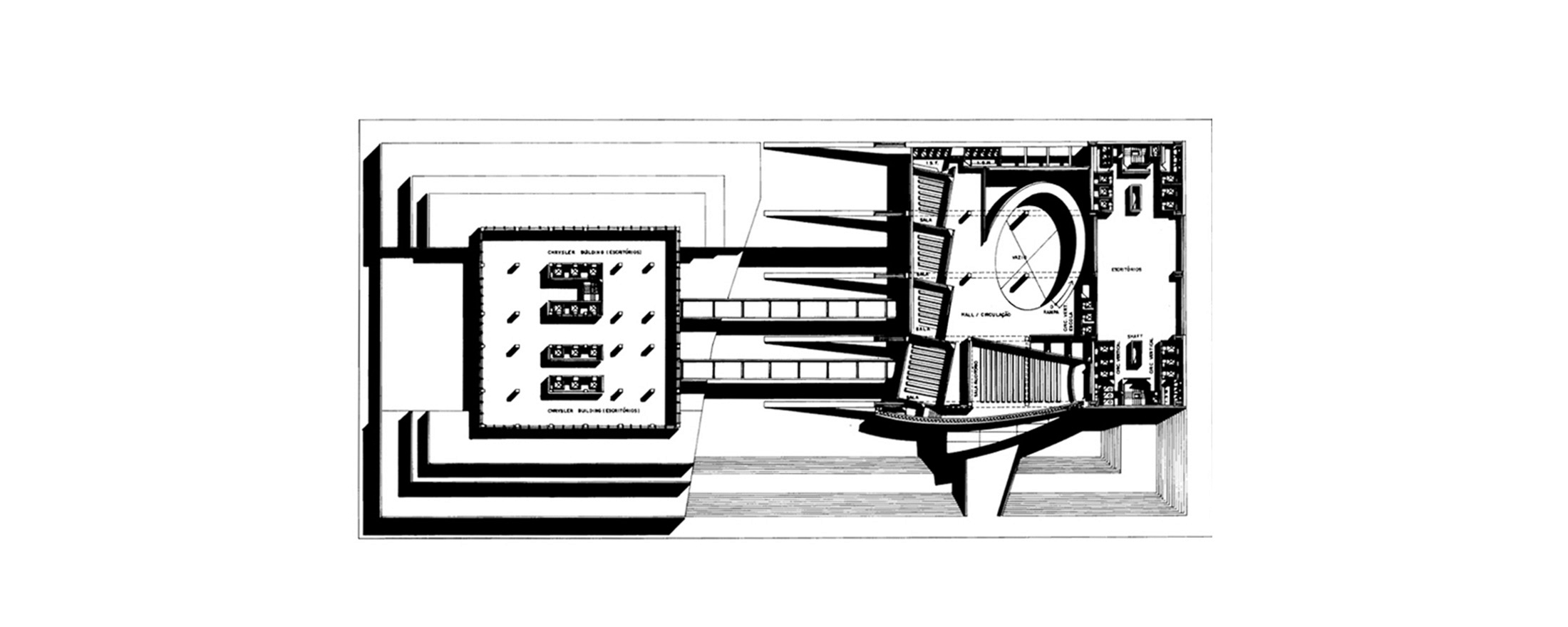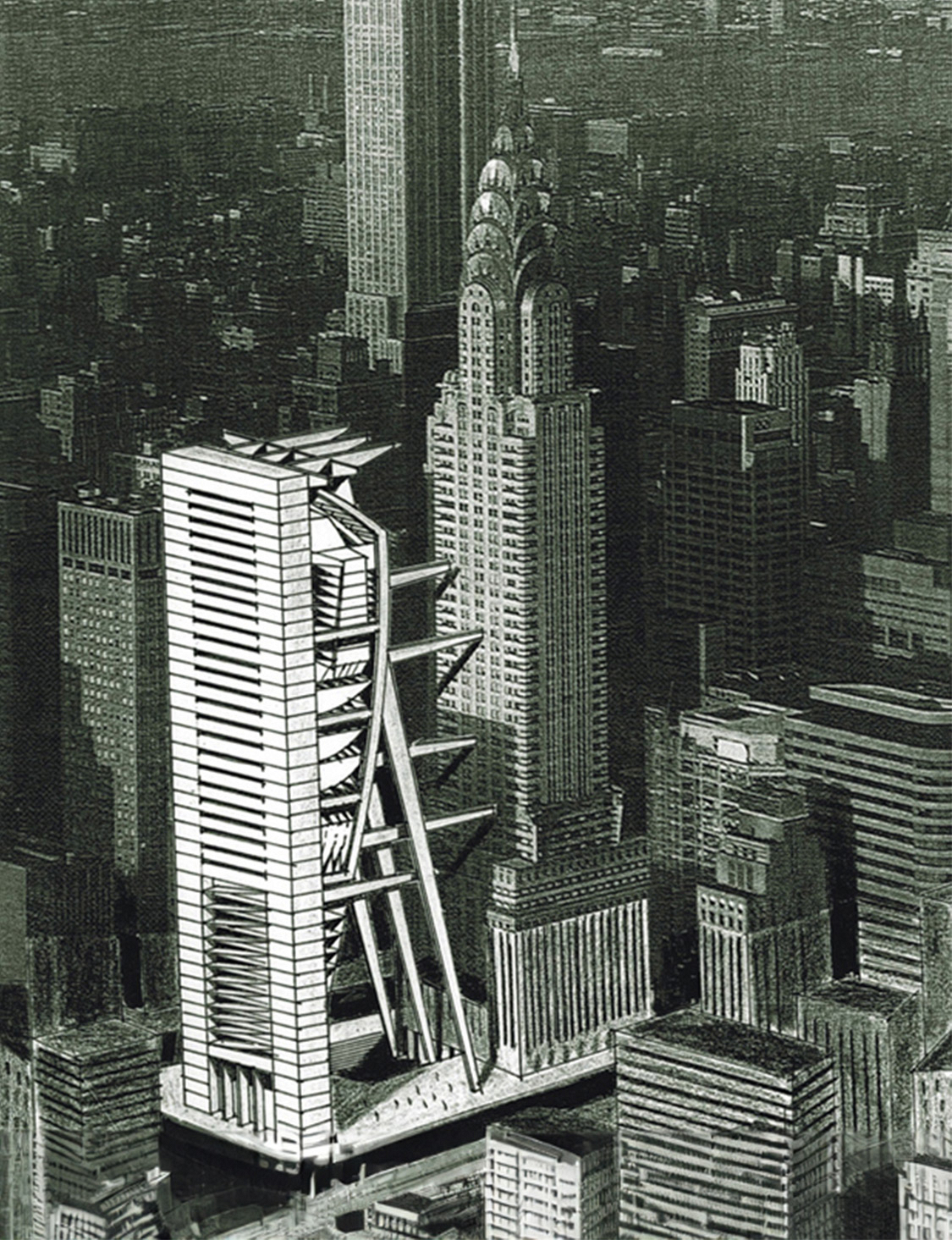 Nova York, EUA 1994Um arranha-céu multifuncional de 90 000 m² com usos justapostos (hotel, escola, teatros, cinemas, escritórios, espaços comerciais etc.), adjacente a um ícone histórico em um dos quarteirões mais movimentados de Manhattan. O complemento para o Chrysler Building, em Nova York (tema do último Van Allen International Student Design Competition), pretende ser uma resposta natural a um complexo de relações dimensionais, tipológicas, estruturais e espaciais, num momento de redefinição de parâmetros conceituais dos arranha-céus.