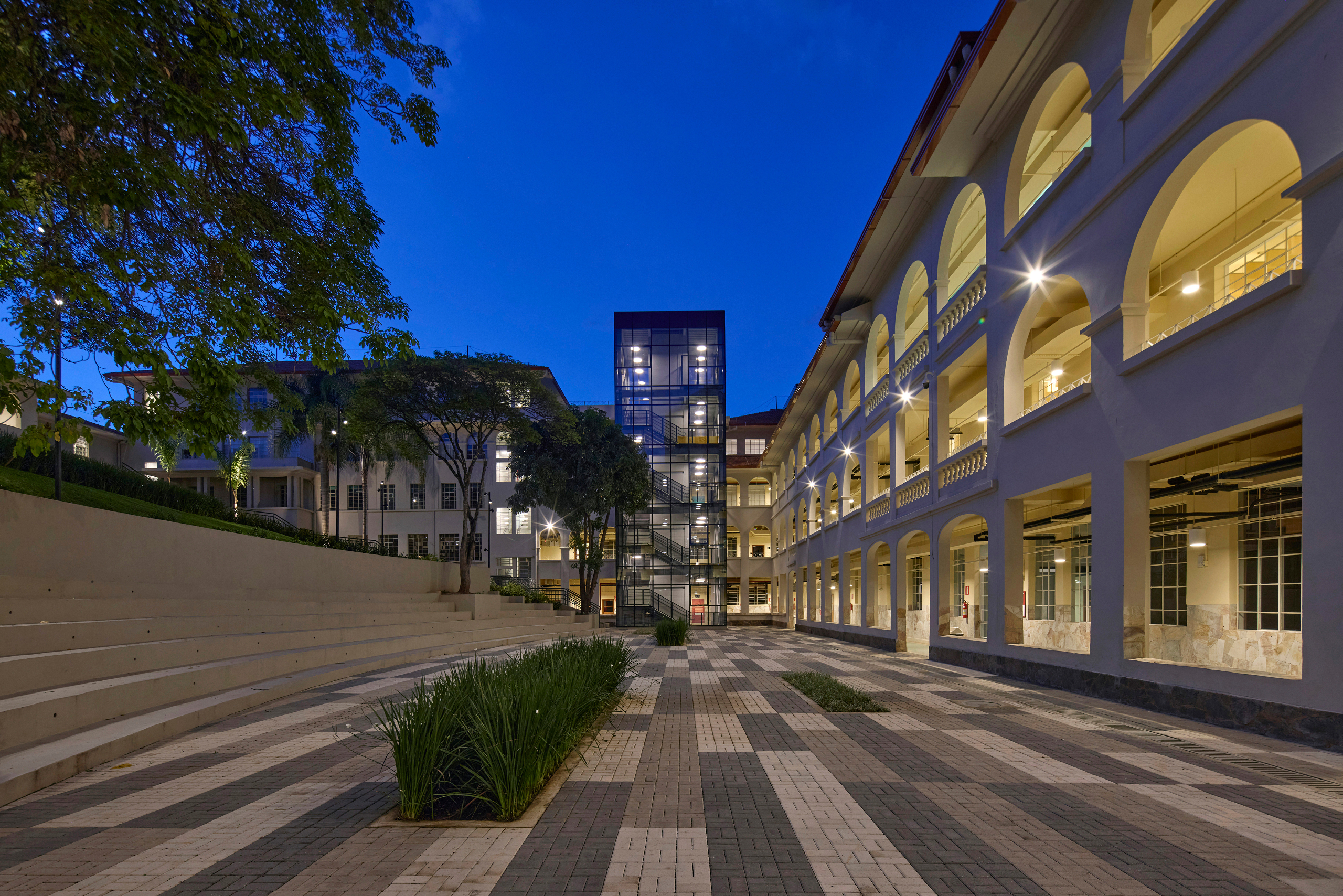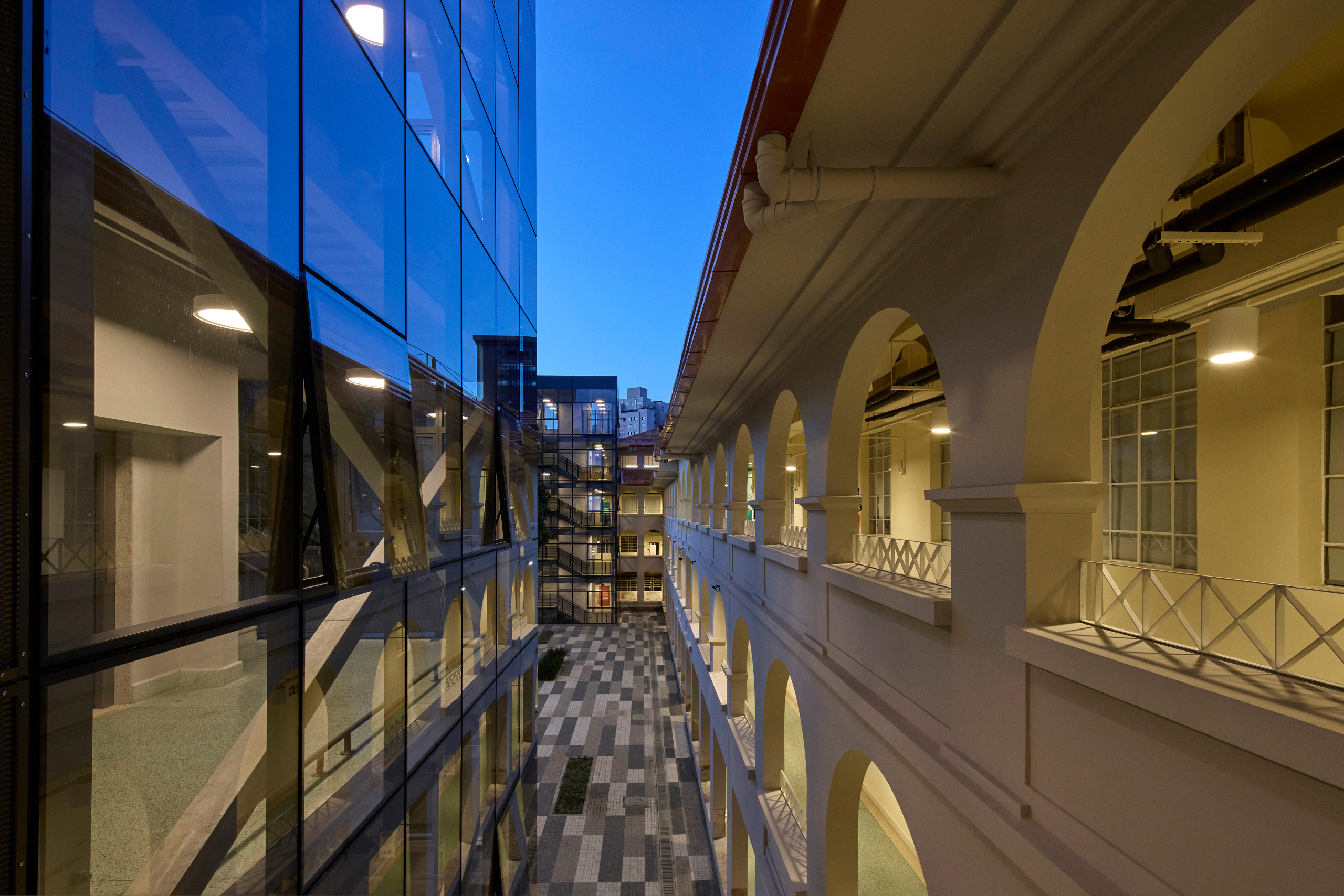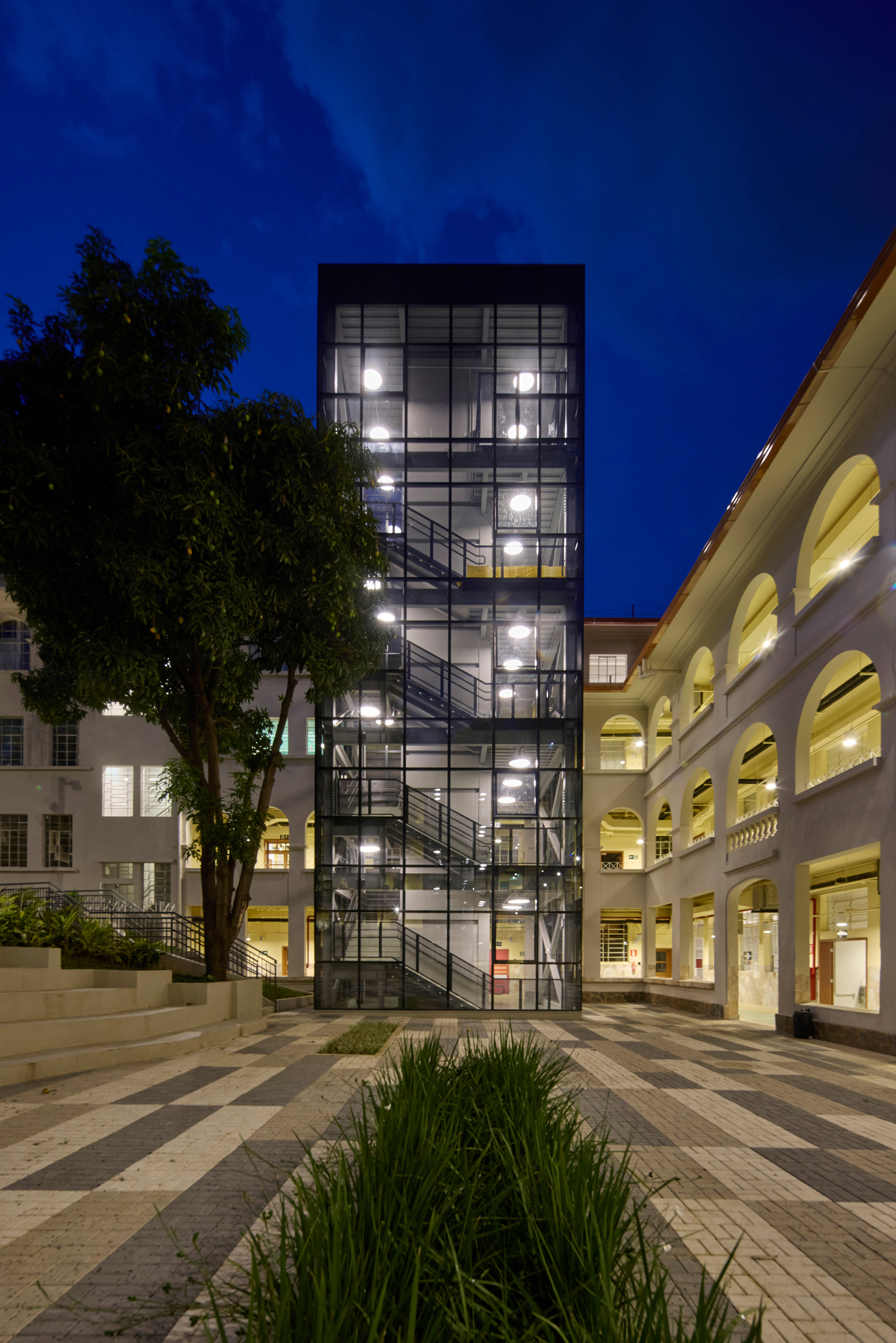 Durante a reforma, as potencialidades do edifício foram reforçadas. As esquadrias originais, em madeira e ferro, foram restauradas ou complementadas de acordo com os modelos originais. O pátio central, por exemplo, passou a atuar como um espaço aglutinador, com novo tratamento paisagístico, reforçando a presença da antiga capela, convertida em auditório, como um espaço simbólico e de referência visual no conjunto. Duas novas torres de circulação vertical, em estrutura metálica e vidro, reforçam a simetria do conjunto e garantem a acessibilidade necessária. As áreas internas com configurações e tratamentos estéticos diferenciados mereceram atenção especial, principalmente devido às demandas da preservação do patrimônio, sendo destinadas aos usos coletivos da escola, como Biblioteca, Auditório, Sala Multiuso e pátios.