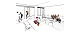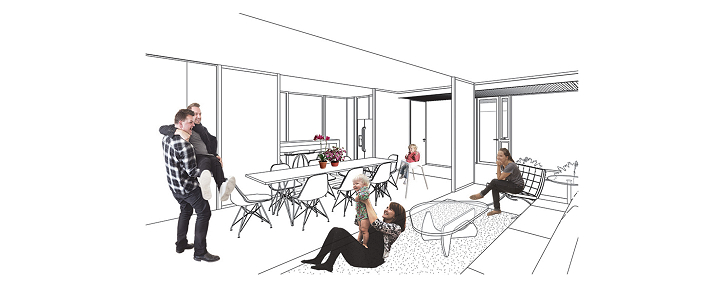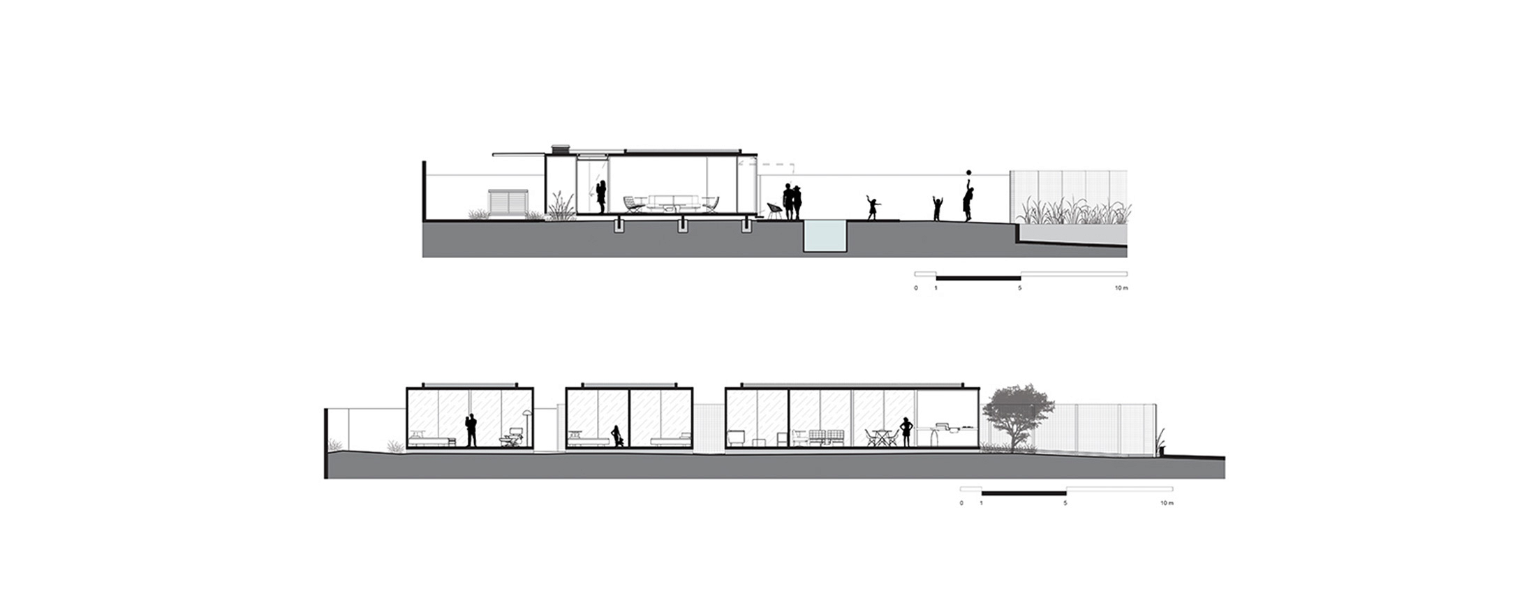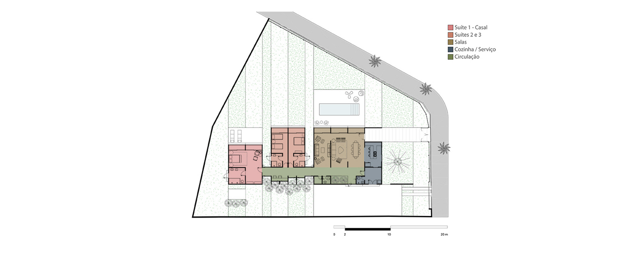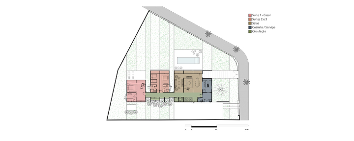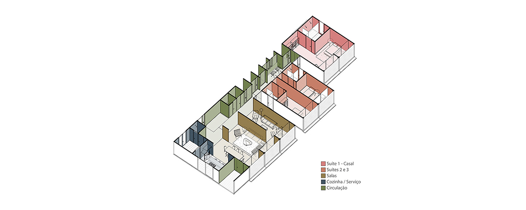 Os espaços internos são organizados em sequência linear a partir da entrada principal. Os afastamentos entre os blocos servem para estabelecer uma setorização clara e garantir luz natural, circulação de ar e a privacidade entre os setores, criando também mini-pátios que se abrem para os banheiros dos quartos. O longo eixo que conecta de leste a oeste os 8 módulos, orientados para o jardim ao Norte, é tratado como um espaço próprio, com jardim de inverno, mini-escritório, lavabo e estantes, e não um mero corredor de circulação.