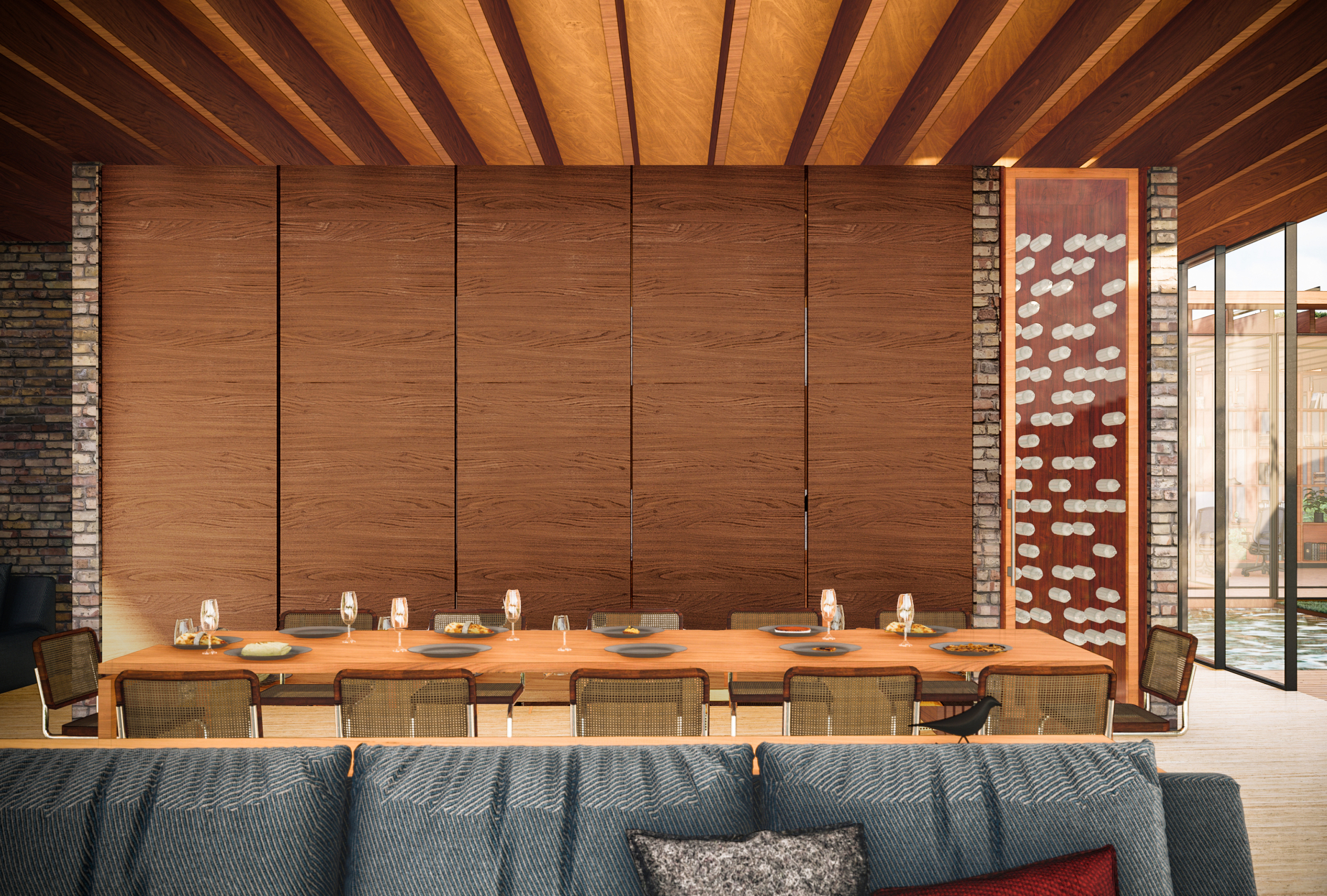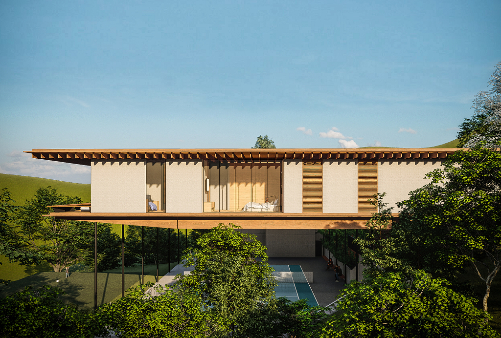 A estrutura e as vedações da casa foram, majoritariamente, desenvolvidas e executadas em painéis de CLT e vigas de MLC, que consistem em lâminas de madeira maciça coladas em sentidos alternados, aumentando sua resistência, rigidez e estabilidade.