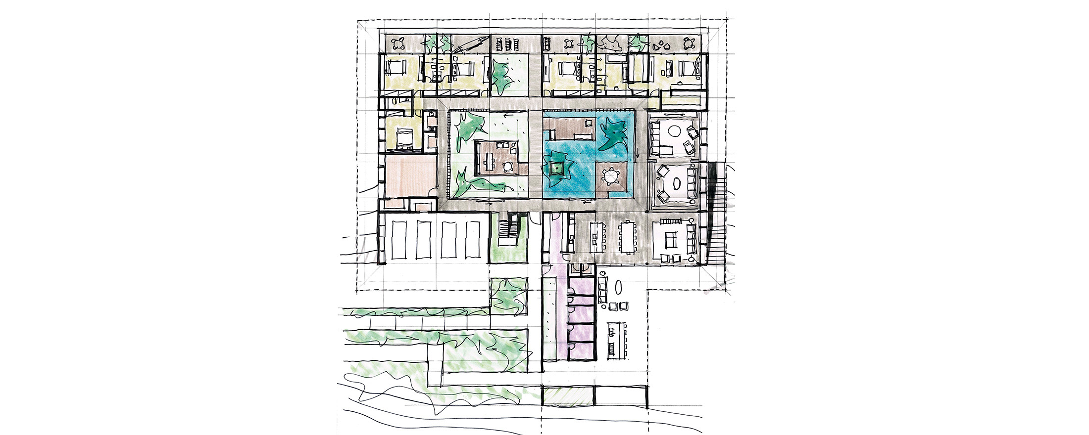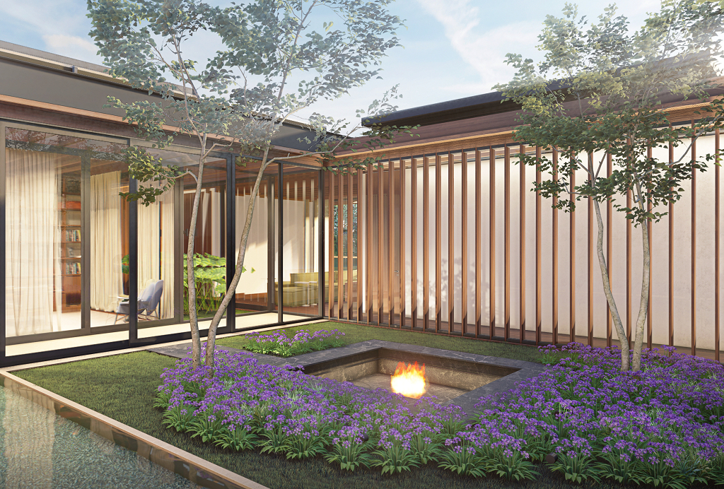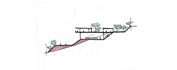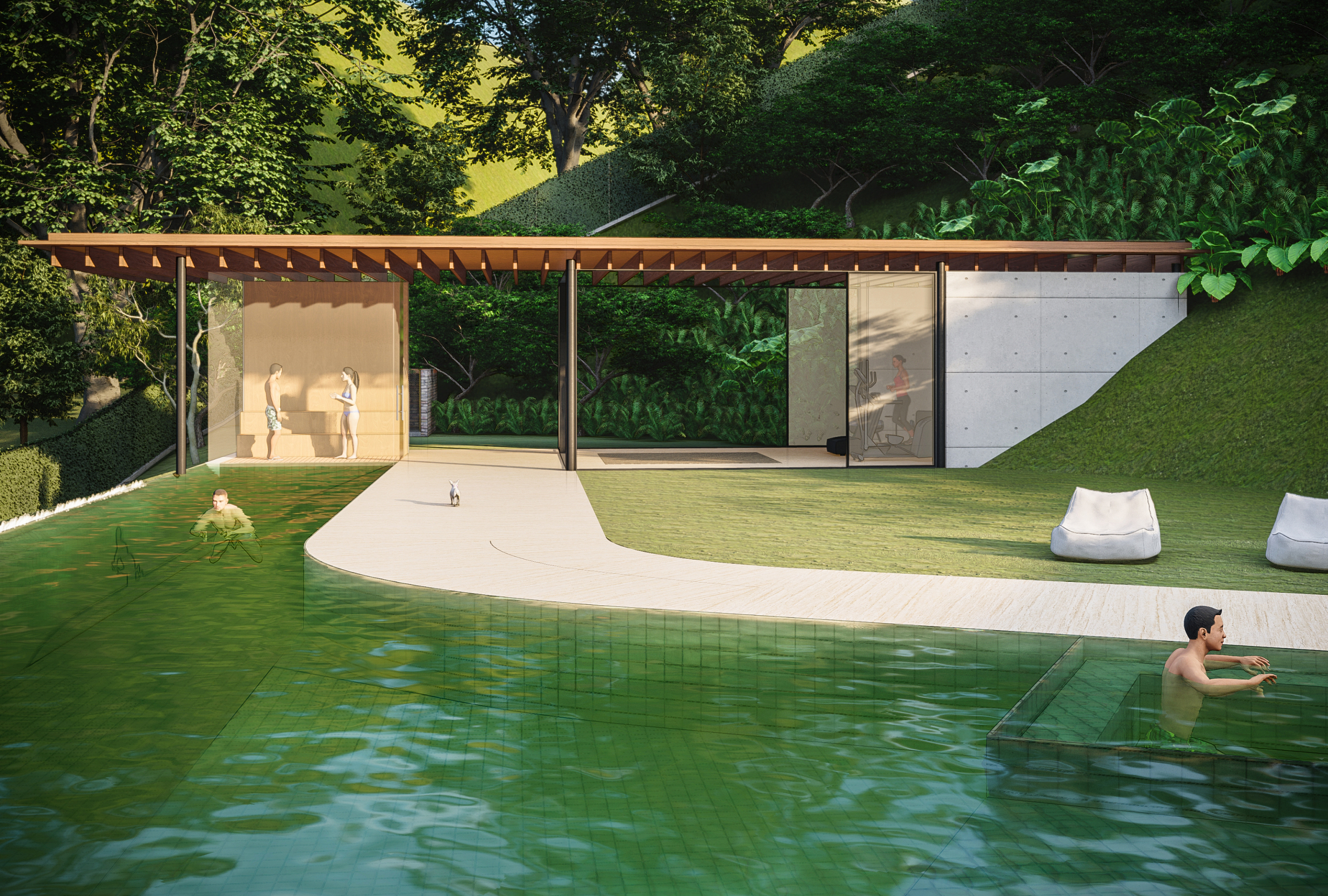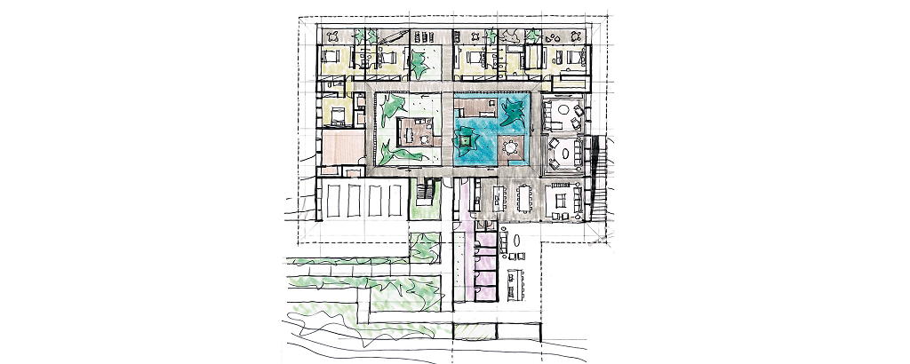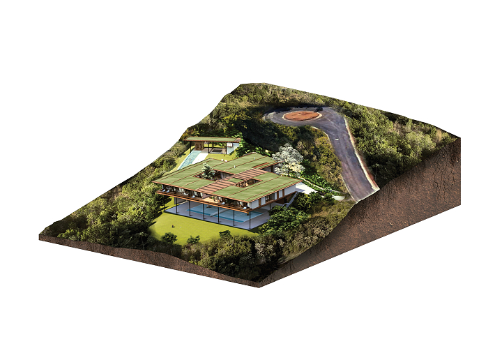 A casa se organiza em torno de um pátio central, orientada diagonalmente de acordo com as curvas de nível de Norte a Sul, aproveitando as vistas do Vale a partir do platô no nível médio do lote, sendo sua construção mal percebida a partir da rua. Uma piscina e uma edícula complementam o programa integrando a área externa do nível principal. No nível da quadra, áreas de apoio e de serviço permitem que ela seja usada também para festas e eventos maiores, com acesso independente.