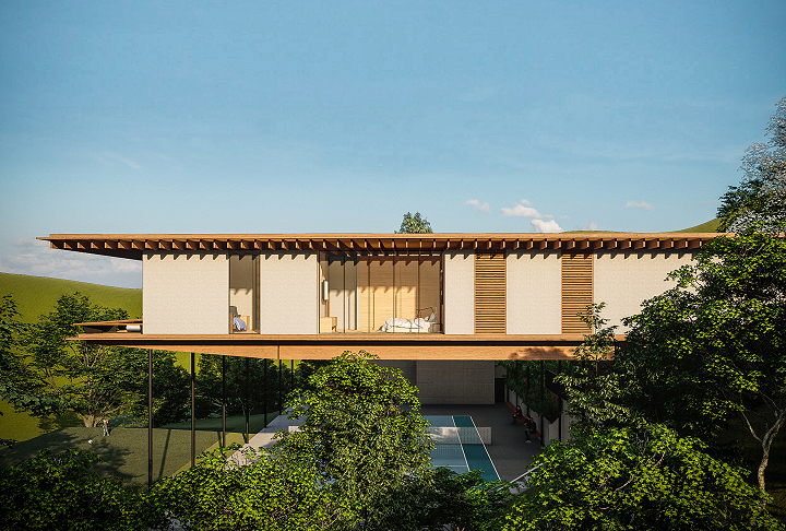 Por ser uma solução pré-fabricada (todas as suas peças foram trazidas de Suzano, SP), sua instalação é rápida e gera menos desperdício que outros sistemas construtivos, economizando tempo, otimizando recursos e gerando um resultado visualmente impactante ao suspender todo o volume da casa sobre o enorme vão livre da quadra de tênis.