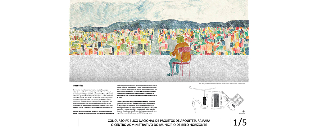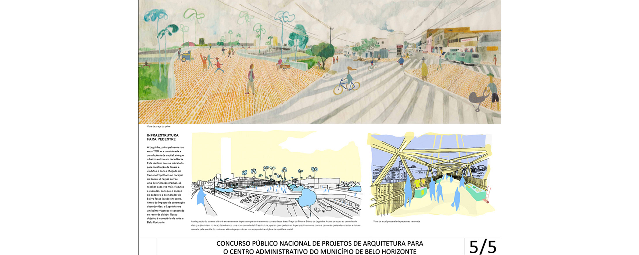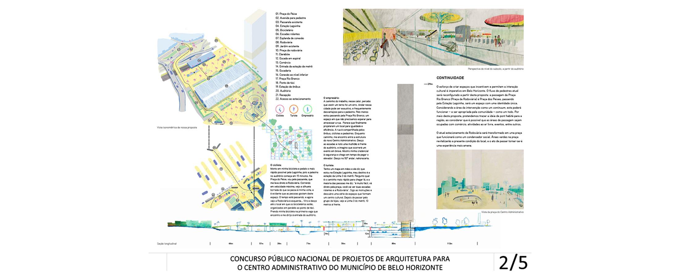 Belo Horizonte, MG - Brasil 2014Enfrentamos uma situação recorrente nas cidades, fissuras que subdividem o tecido urbano, produzindo grandes falhas entre as regiões. A área compreendida por este edital, a passagem da Praça da Rodoviária à Estação Lagoinha e desta à Praça do Peixe, prova que Belo Horizonte é uma cidade rachada. A atual estrutura urbana não mostra soluções para os problemas que a cidade tem. Com todas as possibilidades de como encarar esse problema, uma realidade se apresenta: nós podemos unir essa cidade. Belo Horizonte precisa ser tratada e vista como um todo. Acreditamos em uma cidade que possa resgatar o domínio público para o pedestre. Contudo, a questão que permanece é: como podemos fazê-lo e o que isso significa? Deixando de lado a complexidade dessa tarefa, devemos primeiramente atender a uma das necessidades humanas mais básicas. A necessidade de habitar o espaço. Como arquitetos, devemos pensar espaços que abarcam todas as formas de comportamento. Espaços que tenham individualidade mas que também sejam capazes de absorver diversidade e caos. Por isso nossa proposta respeita o que já funciona, e ao mesmo tempo aumenta a adaptabilidade dos espaços. É uma proposta que busca atender às questões atuais, mas mantém em mente a possibilidade de transformação no futuro.
