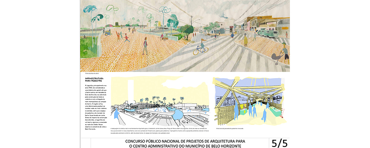Considerando a situação urbana que encaramos, parece que, aos poucos, a relevância de construir uma cidade para pedestres está desaparecendo. Torna-se evidente que os pedestres são os mais afetados pelas fraturas produzidas pelo sistema viário atual: o excesso de infraestrutura viária divide, separa. Este é o porquê de considerarmos o acesso de pedestres um dos elementos-chave dessa proposta. A Lagoinha, principalmente nos anos 1960, era considerada a zona boêmia da capital, até que o bairro entrou em decadência. Este declínio deu-se sobretudo pela construção de túneis e viadutos e com a chegada do trem metropolitano ao coração do bairro. A região sofreu uma deterioração gradual, ao receber cada vez mais viadutos e avenidas, sem que o espaço do pedestre e do morador do bairro fosse levado em conta. Antes do impacto da construção das rodovidas, a Lagoinha era um bairro vigoroso e conectado ao resto da cidade. Nosso objetivo é conectá-la de volta a Belo Horizonte. O esforço de criar espaços que incentivem e permitam a interação cultural é imperativo em Belo Horizonte. O fluxo de pedestres atual será reconfigurado a partir desta proposta: a passagem da Praça Rio Branco (Praça da Rodoviária) à Praça dos Peixes, passando pela Estação Lagoinha, será um espaço com uma identidade única. Considerando a área da intervenção como um continuum, esta poderá funcionar – e ser apropriada pela comunidade – como um todo. Por meio desta proposta, pretendemos trazer a ideia de pont habité para a região, ao considerar que é possível que as áreas de passagem sejam ocupadas com comércio, atividades ao ar livre, eventos, entre outros. Além de todas as características urbanas que precisam ser cuidadas, esta área de intervenção tem um potencial-chave que trabalha em nosso favor. É uma área viva e inquieta. Existe uma paleta de interações que, dia a dia, acontecem. Nosso entendimento da ocupação atual do espaço traz à mesa camadas de informação. Entretanto, o desafio presente está no fato de que essas interações estão acontecendo de maneira muito informal. Traçando essa linha de pensamento, nosso design aproxima-se da ideia de uma arquitetura não-invasiva, mas que estrutura e formaliza essa interação. Com pequenas intervenções, como iluminar a passarela de pedestres, permitimos a justaposição de atividades que hoje já acontecem, como o comércio informal que lá existe. Estamos explorando a possibilidade da apropriação de espaços, fazendo-o mais seguro e usável. É nosso dever nos familiarizar com o que a cidade oferece. Ao abraçar o que deve ser preservado, temos como meta a acomodação, e não a exclusão. É o caso do estacionamento do edifício da atual RISP, que será transformado em uma praça aberta ao público, além de incorporar áreas verdes na paisagem. O Centro Administrativo de Belo Horizonte (CAMBH) funcionará como um farol para a cidade, em um local de importância histórica e social. O edifício foi concebido como uma estrutura que pode servir de ponto de referência ao nos movermos pela cidade. É uma estrutura que se beneficia da simplicidade de sua forma e da elegância de sua verticalidade. O desenho foi pensado como uma torre que representa a culminação de um dos mais importantes eixos do plano urbano de Belo Horizonte, a Avenida Afonso Pena. Sua presença resultará na criação de um ícone. A verticalidade da torre segue a lógica da redução de pegadas, a resposta ideal a um contexto urbano cujas conexões visuais, ao nível do pedestre, não seriam comprometidas. Trata-se de um edifício que, além de icônico, terá complexidades e usos diversos, tanto para os funcionários da PBH, como para aqueles que necessitam de seus serviços e para o transeunte. O Centro Administrativo acomoda espaços diversos no nível do subsolo, que funcionará como um lugar de lazer, com um auditório e uma área de comércio. Embora localizado no subsolo, a luz natural, obtida a partir de aberturas no teto, propiciará uma atmosfera diáfana. O espaço comercial será localizado no limiar entre a Rodoviária e o espaço que abarca a estação de metrô e o auditório. O fácil acesso entre esses espaços e a praça, no nível superior, criará uma conexão visual entre os usuários do metrô, os frequentadores da área comercial e os transeuntes. Portanto, existirá uma interessante justaposição das velocidades dos fluxos entre o novo Centro Administrativo e a Rodoviária. Podemos distinguir três velocidades principais: as pessoas que aguardam atendimento na recepção da área do CAMBH, a velocidade dos pedestres e, por último, a velocidade do metrô. O atual estacionamento da Rodoviária será transformado em uma praça que funcionará como um condensador social. Áreas verdes na praça revitalizarão a presente condição do local, e o ato de passar tornar-se-á uma experiência mais amena. No lugar de barreiras evidentes, defendemos um esquema de espaço diverso, em que pedestres compartilharão a rua com o transporte público e os ciclistas. Queremos criar uma superfície contínua que introduza uma extensão de velocidades diferentes, atualmente separadas pelas calçadas (para os pedestres) e pela via principal (para o transporte público). A continuidade que governa esse esquema permite a coexistência de pedestres e do transporte coletivo. É nosso objetivo que esse projeto abrace o imprevisível e responda às demandas que Belo Horizonte apresenta, para criar uma arquitetura simbolicamente plural.