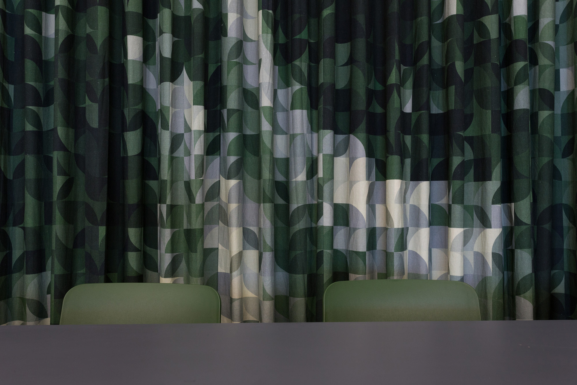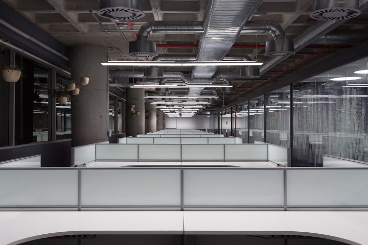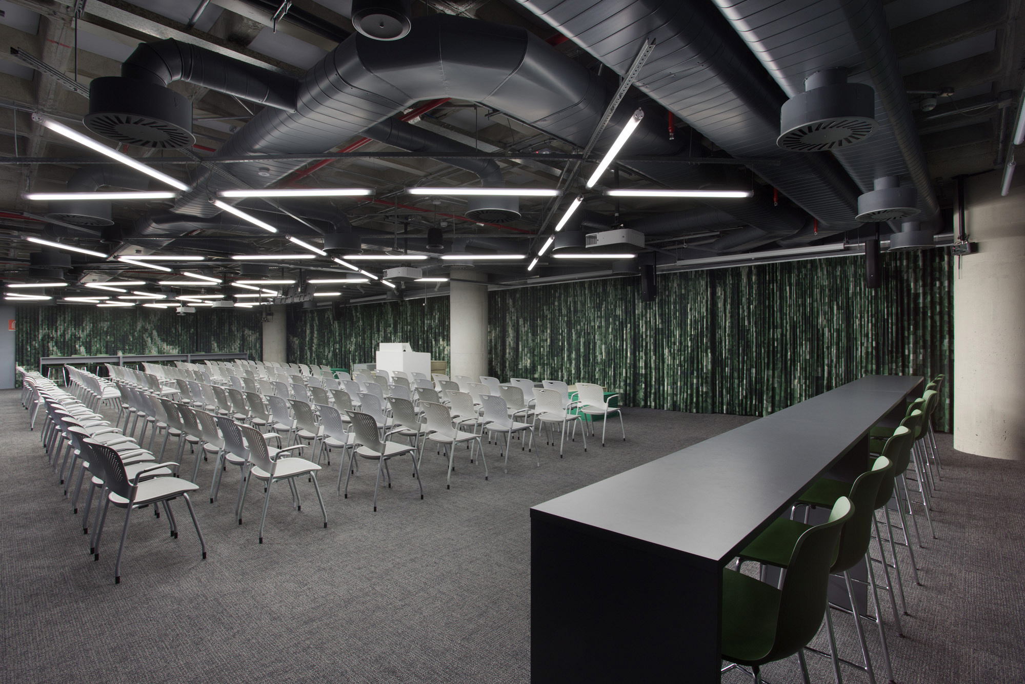 Espaços / Ambiente: Diferentemente da organização convencional de escritórios, as “áreas comuns” ocupam quase tanto espaço quanto as “áreas de trabalho”. As áreas de lazer podem ser usadas também como áreas de trabalho, fazendo com que ambas estejam constantemente interligadas. Nas áreas de trabalho, os materiais utilizados se referem ao domínio virtual (ou intangível): transparência dos vidros, telas de privacidade e superficies lisas, com o objetivo de tornar o espaço o mais imersivo possível. Nos espaços comuns, os materiais se refrem à cultura e à paisagem de Minas Gerais: materiais táteis, texturas, tons terrosos, trançados e malhas. A base da paleta de cores e as soluções de iluminação também foram escolhidas para reforçar o conceito binário: tons de azul (“frios”) são predominantes nos espaços de trabalho, enquanto tons de vermelho (“quentes”) dominam as áreas comuns.