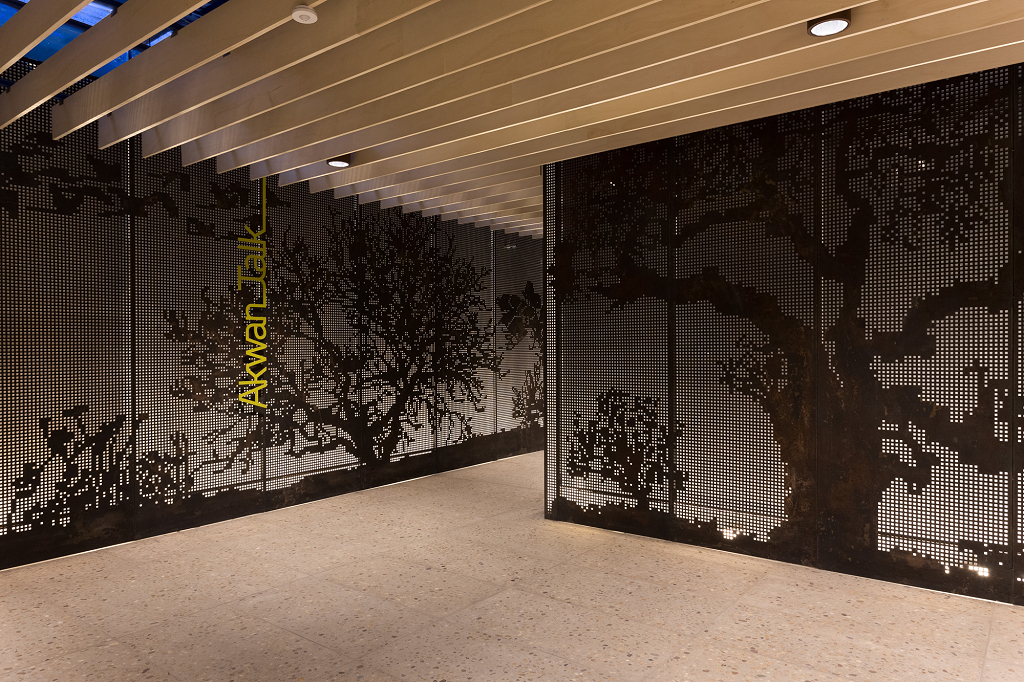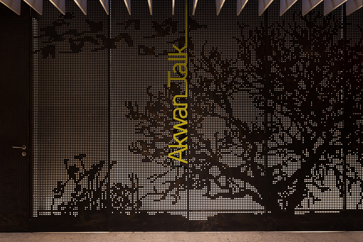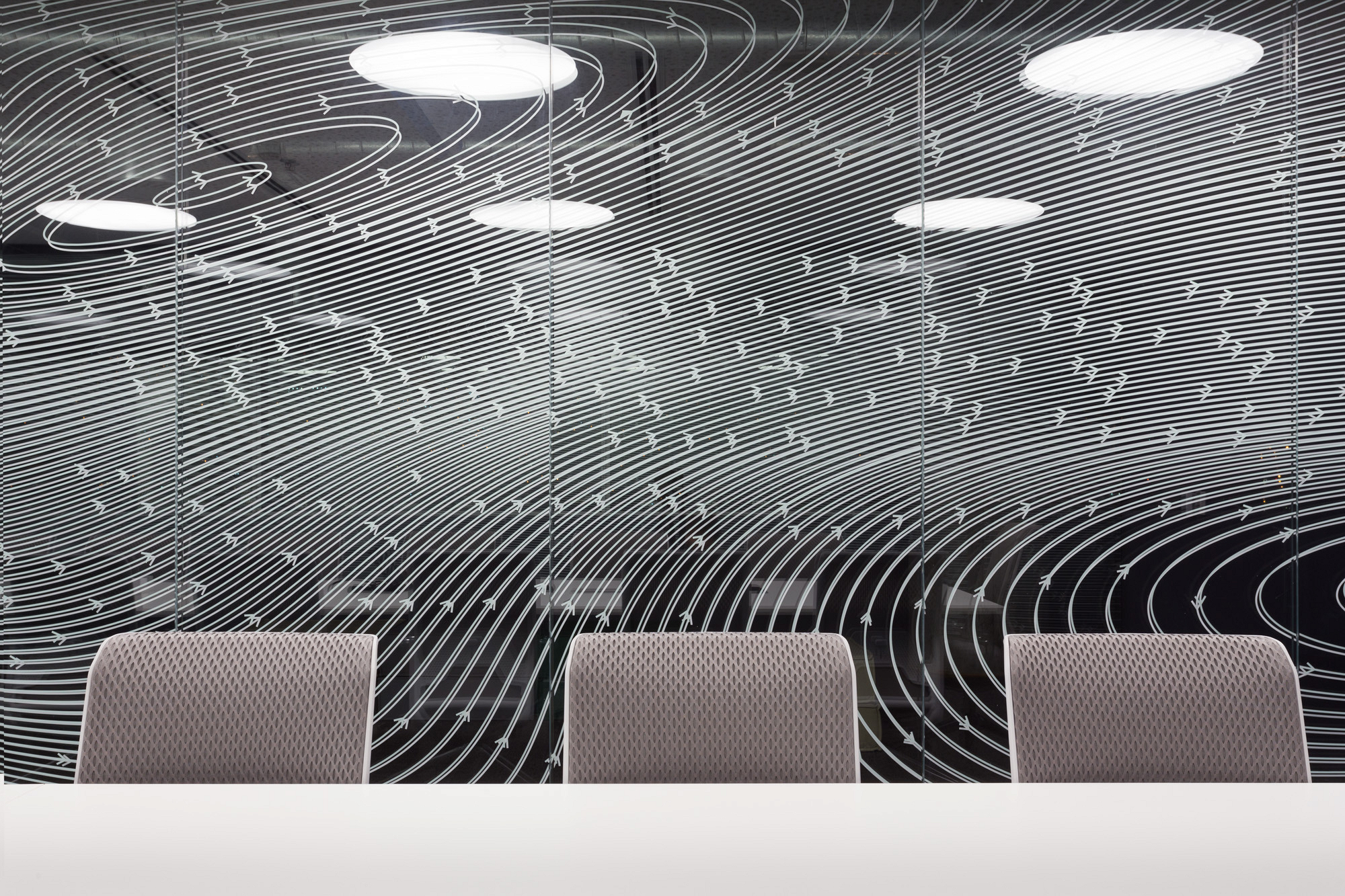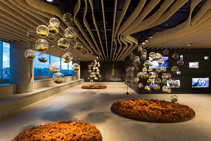 Climatologia / Design Paramétrico: Os padrões gráficos nas superficies de vidro das salas de reunião foram projetados para atender tanto aos requisitos de transparência quanto os de privacidade. Dados climáticos reais foram coletados para gerar, através de design paramétrico (em colaboração com a SUBdv), uma camada de infográficos ampliados, com resultados estéticos inesperados. Os dados relacionados a umidade / precipitação e ventos são de Belo Horizonte, enquanto os dados de pressão são globais, gerando diferentes “nuvens” em cada andar. Paisagismo Rupestre + Tecnológico: O projeto de paisagismo envolveu o biólogo Luiz Gluck, que trabalha num pioneiro e complexo processo tecnológico. As plantas do Cerrado (campos rupestres) são clonadas e cultivadas in vitro, com a capacidade de indicar variações sutis na qualidade do ar. A reprodução das espécies locais também é uma iniciativa inovadora no contexto social, envolvendo centenas de famílias anteriormente dedicadas ao extrativismo no sertão.