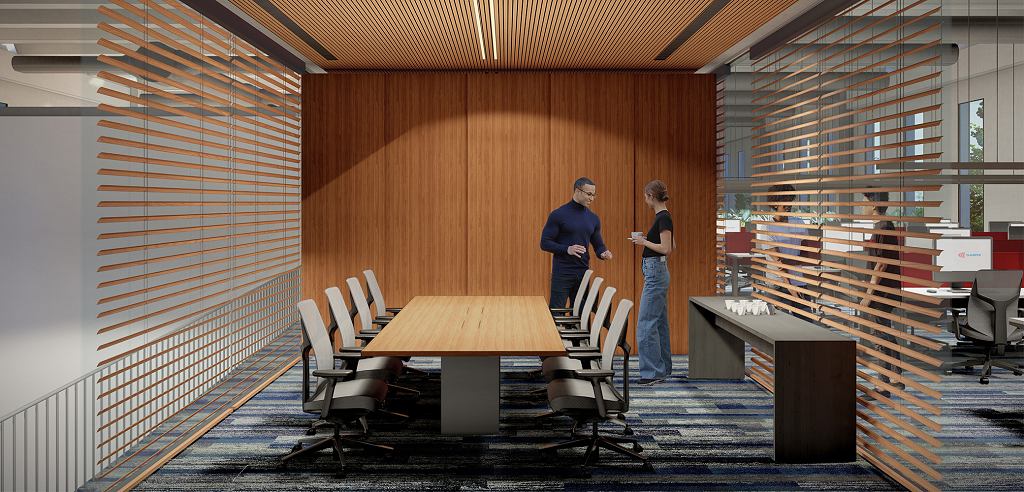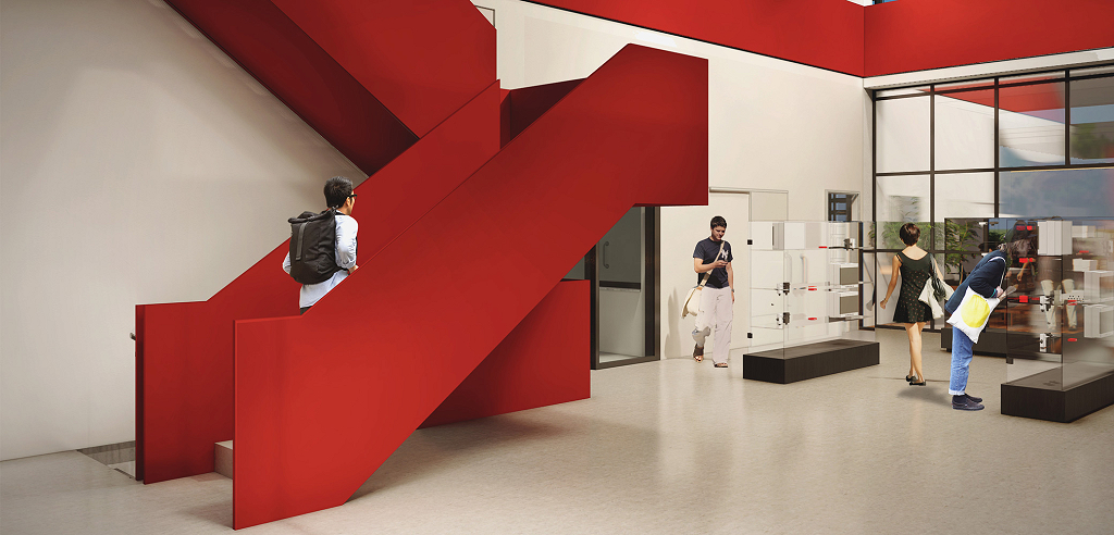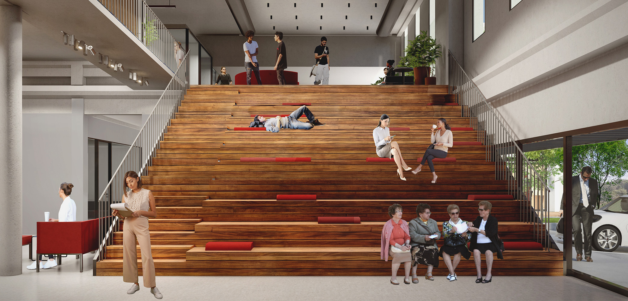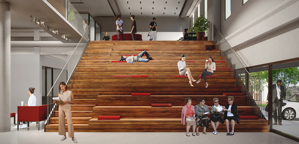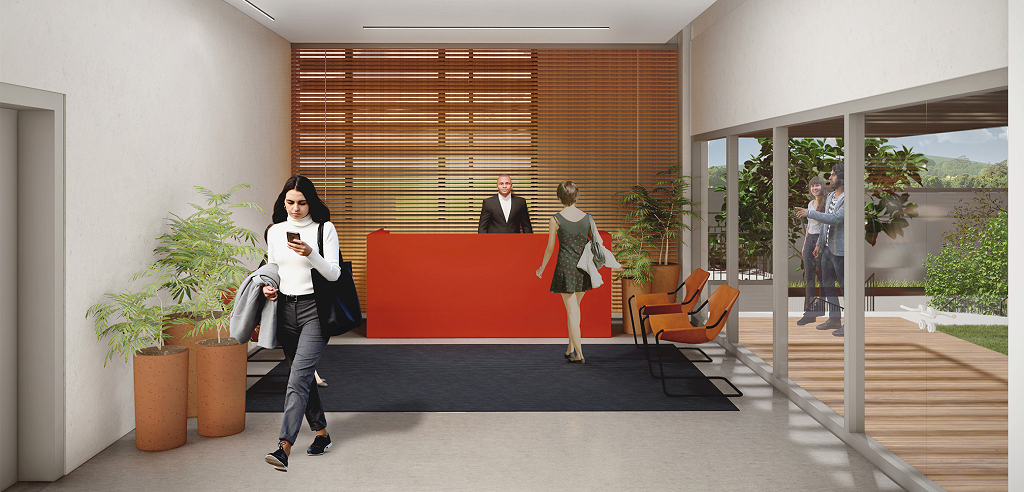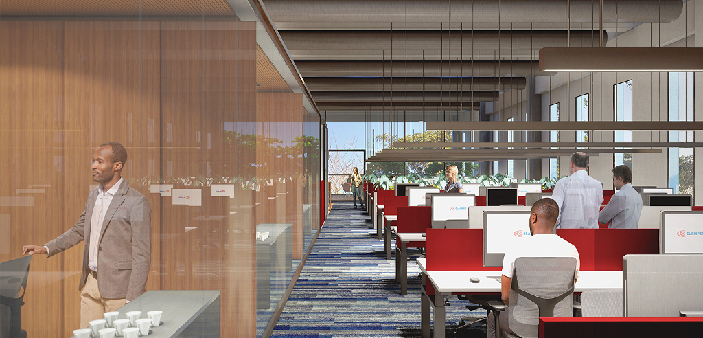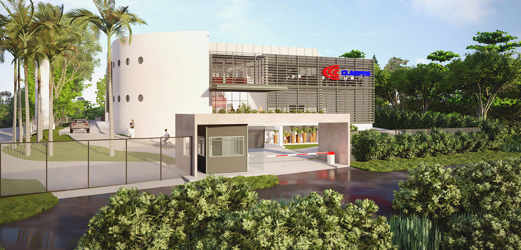 O projeto consiste na reforma de um edifício de dois pavimentos, já existente, que se transformou em um novo espaço de trabalho, a sede administrativa, refletindo os ideais da CLAMPER por meio de sua forma e conteúdo. A fachada foi reconfigurada, incluindo novas e amplas aberturas que conectam o interior e exterior do edifício, trazendo os jardins para dentro e proporcionando iluminação natural. No primeiro pavimento, encontramos a recepção e as áreas comuns, como o restaurante, o café e as áreas de jogos, atendendo às demandas contemporâneas de trabalho, como flexibilidade, áreas de descompressão, horizontalidade, conforto e informalidade, além de atender às necessidades específicas do programa. O segundo pavimento possui conjuntos de mesas lineares de trabalho, setorizados de acordo com os vários departamentos, além de salas de reunião com layout flexível, salas privadas, cozinha integrada e um terraço. Os dois pavimentos estão conectados de duas maneiras. Primeiro, por meio de uma escada localizada em um hall de pé direito duplo, totalmente pintada de vermelho, inspirada nas cores do logotipo da empresa, que se estende pelas demais áreas de circulação vertical ao longo do edifício. Segundo, através de uma grande arquibancada-escadaria, com amplos degraus e largos pisos que não apenas permitem a passagem, mas também incentivam a interação entre as pessoas. Esses espaços interativos comuns não só oferecem um alívio do estresse e relaxamento, como também estimulam o trabalho e a produtividade.