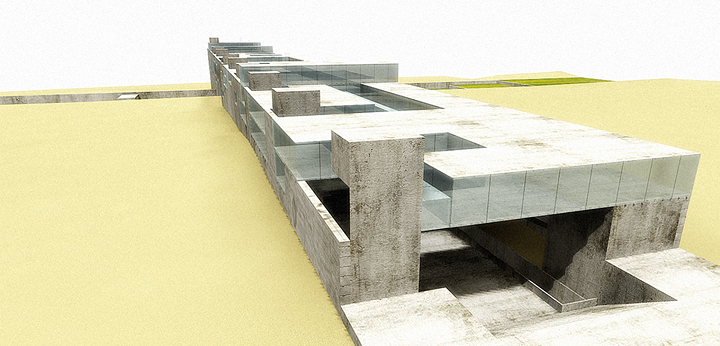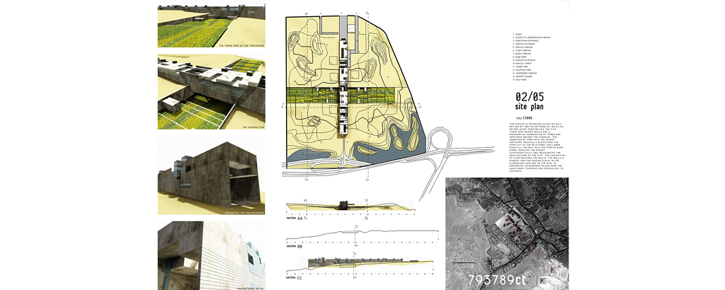Cairo, Egito 2002Proposta para o concurso internacional patrocinado pela Unesco e governo do Egito. O prédio funciona como uma grande rua de circulação de pedestres que une duas avenidas na planície da Giza, onde estão as três maiores pirâmides do Egito. Sob essa rua pública estará a exposição permanente documentando os nove períodos da história egípcia. A rua é a materialização dos nove períodos da civilização egípcia: quanto mais alto o nível da rua, mais recente será o período da exposição sob a rua. Um parque atravessa o prédio e o conecta, por uma linha imaginária, à diagonal da pirâmide de Quéops.