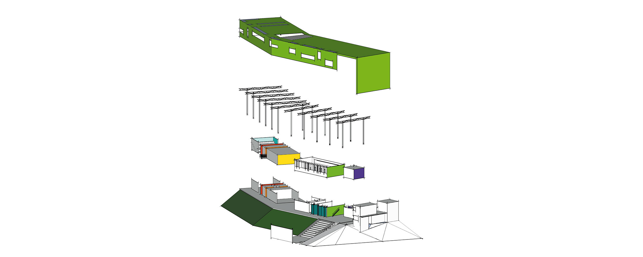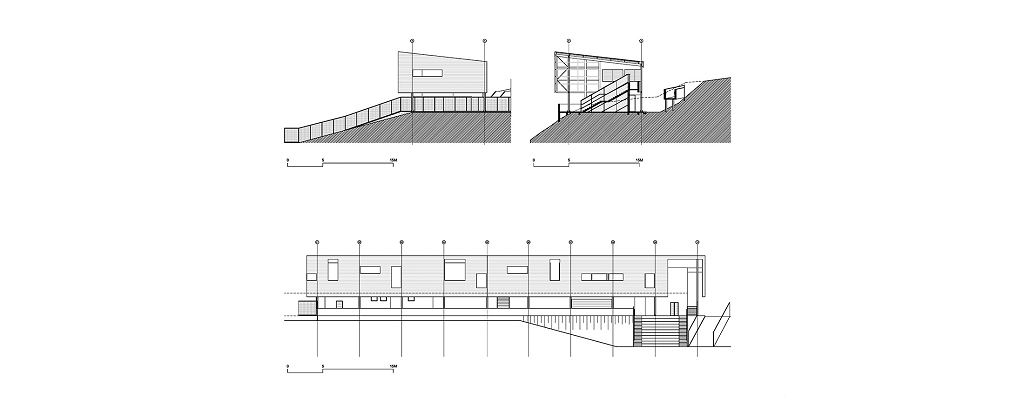 Devido ao baixo orçamento, o conceito da edificação é simples: blocos de atividades separados por circulações e pátios internos, cobertos por um invólucro de telha metálica perfurada.