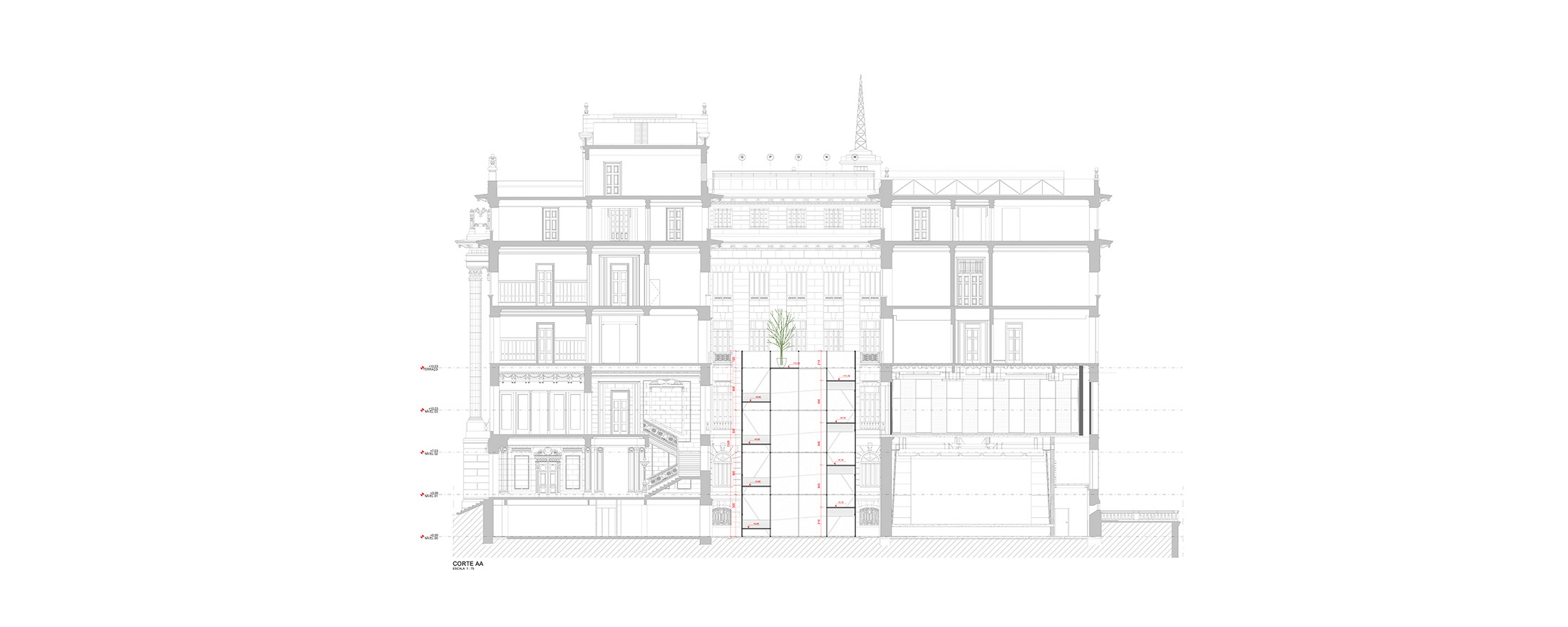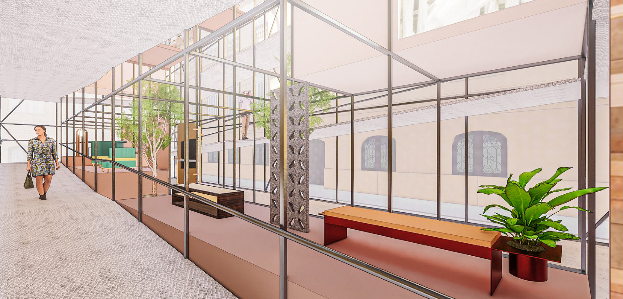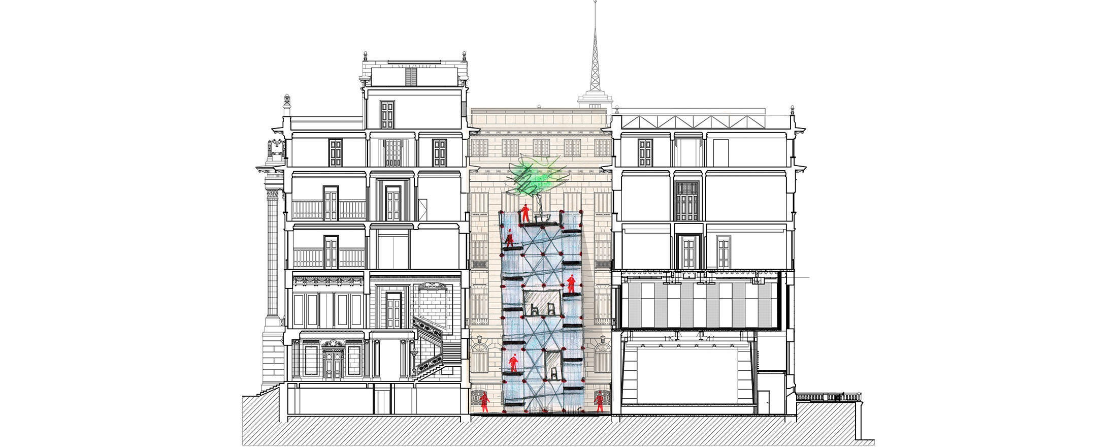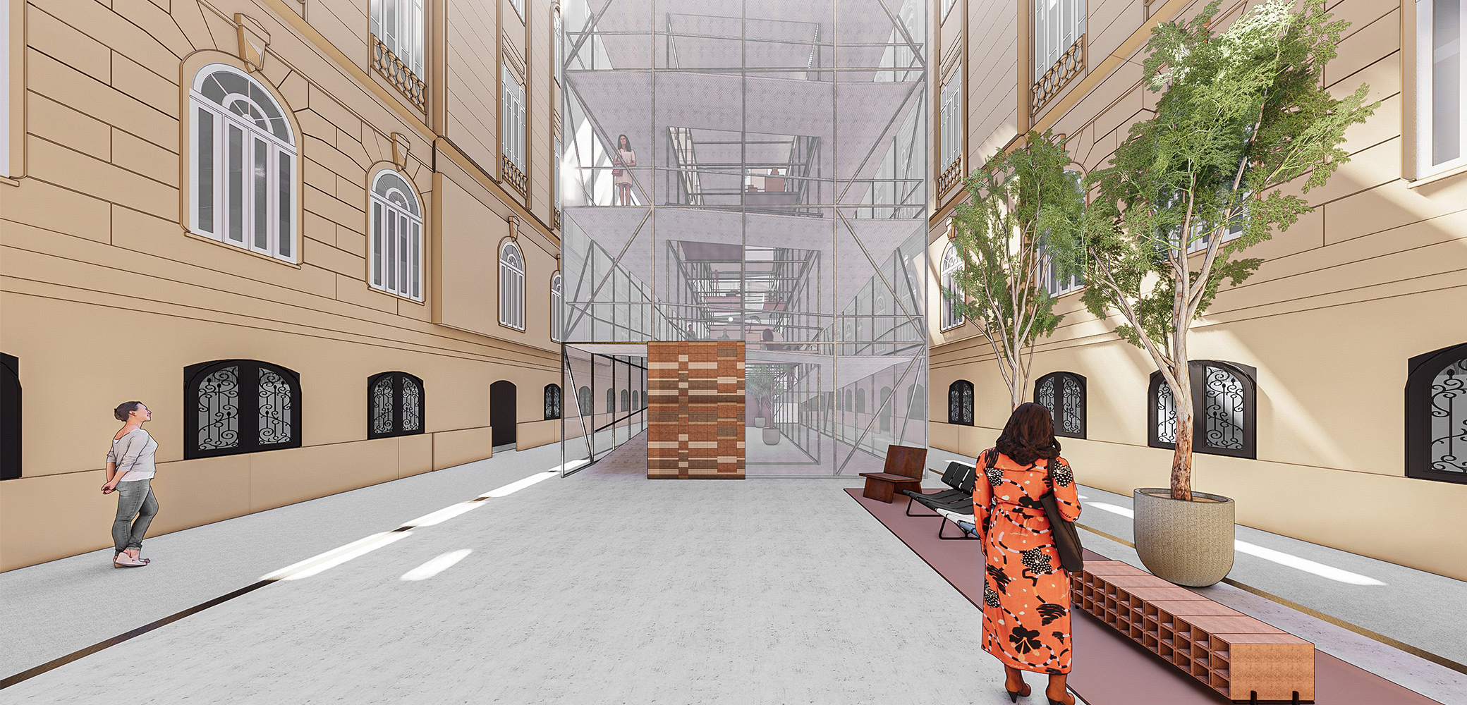 Belo Horizonte, MG - Brasil 2020O projeto se fundamenta nas propostas radicais de arquitetura de vanguarda das décadas de 1950 e 1960 — notadamente as visões de Yona Friedman, Cedric Price e Buckminster Fuller — que idealizavam soluções de velocidade, leveza e flexibilidade como resposta aos desafios urbanos e sociais. Em um cenário global cada vez mais volátil, esses conceitos se mostram cruciais para a arquitetura contemporânea. Neste contexto, propomos a inserção de um pavilhão no vazio central do edifício histórico do CCBB. A estrutura atua como um dispositivo espacial dinâmico, concebido para gerar experiências inesperadas e visadas surpreendentes do pátio interno. O ponto culminante da ascensão é uma praça suspensa que se abre totalmente, integrando a cobertura zenital e, metaforicamente, trazendo o céu para dentro do coração do CCBB.