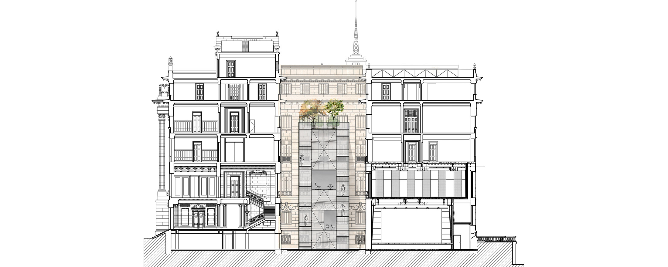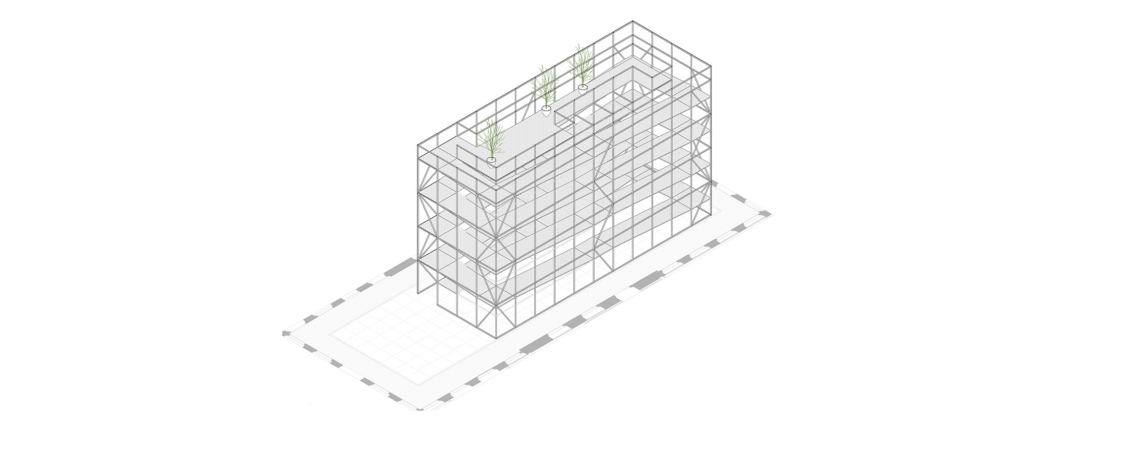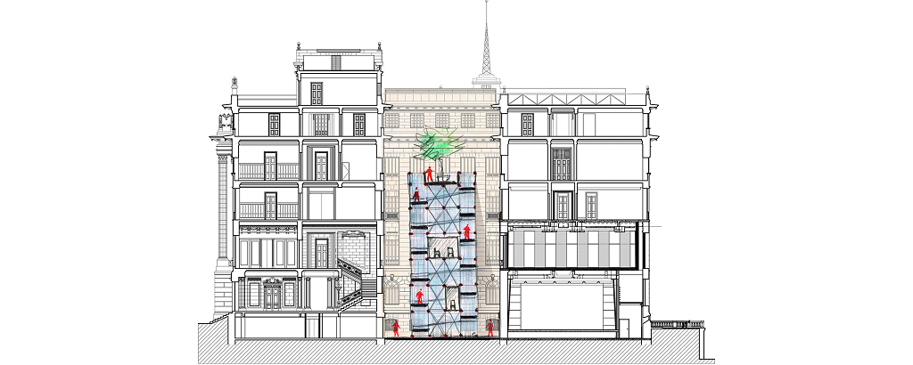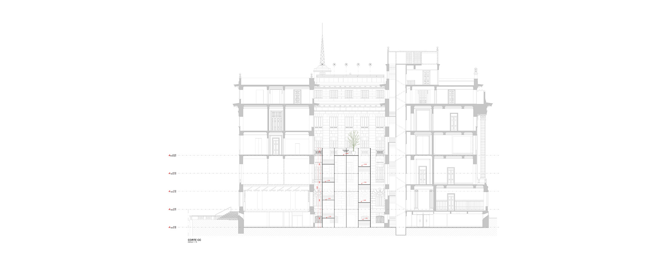 Belo Horizonte, MG - Brasil 2020O projeto se fundamenta nas propostas radicais de arquitetura de vanguarda das décadas de 1950 e 1960 — notadamente as visões de Yona Friedman, Cedric Price e Buckminster Fuller — que idealizavam soluções de velocidade, leveza e flexibilidade como resposta aos desafios urbanos e sociais. Em um cenário global cada vez mais volátil, esses conceitos se mostram cruciais para a arquitetura contemporânea. Neste contexto, propomos a inserção de um pavilhão no vazio central do edifício histórico do CCBB. A estrutura atua como um dispositivo espacial dinâmico, concebido para gerar experiências inesperadas e visadas surpreendentes do pátio interno. O ponto culminante da ascensão é uma praça suspensa que se abre totalmente, integrando a cobertura zenital e, metaforicamente, trazendo o céu para dentro do coração do CCBB.