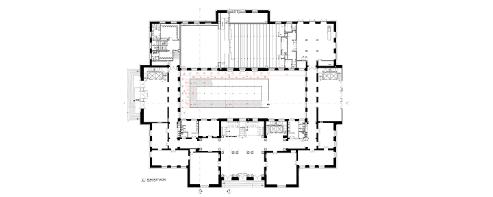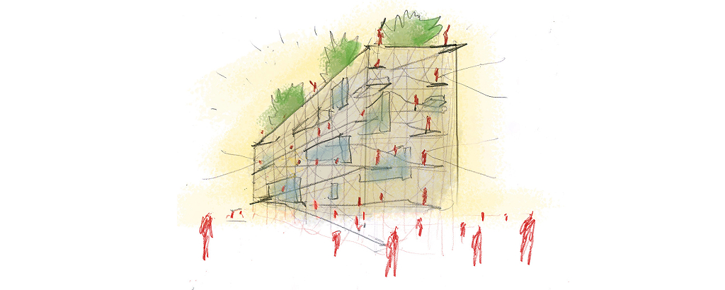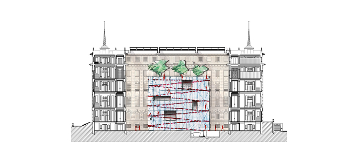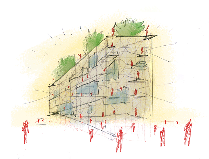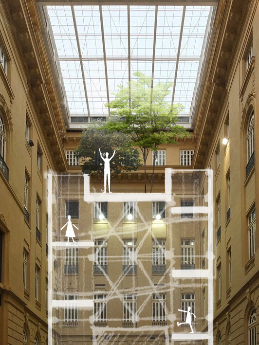 Esse pavilhão (um prisma de 7m de largura, 20m de comprimento e 18m de altura) pretende criar uma experiência espacial dinâmica no vazio do edifício histórico, possibilitando usos incomuns e visadas surpreendentes do pátio interno do CCBB. Ao ascender até uma praça suspensa próxima à cobertura zenital, o pavilhão se abre totalmente ao ar livre, trazendo o céu para dentro do pátio.