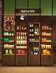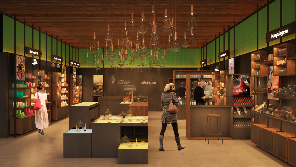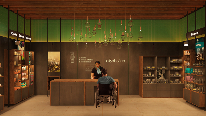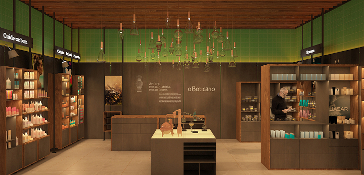 como em uma biblioteca, refere-se ao local de pesquisa; as mesas centrais, local de trabalho repleto de referências, instrumentos e inspirações; e os expositores altos, característicos das boticas clássicas, como local de guarda e exposição de seus produtos.