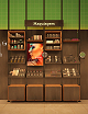 Na loja, também a “casa do alquimista”, a apropriação da linguagem dos gabinetes é uma forma de explorar os diversos ambientes de trabalho do boticário. Uma ala de armários perpendiculares à parede,