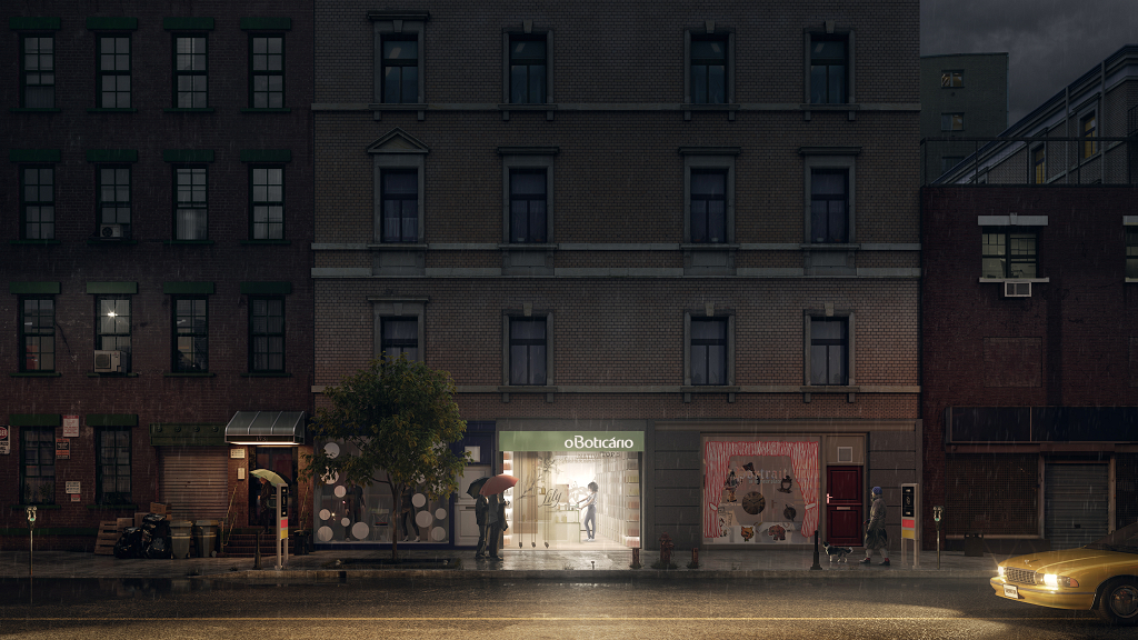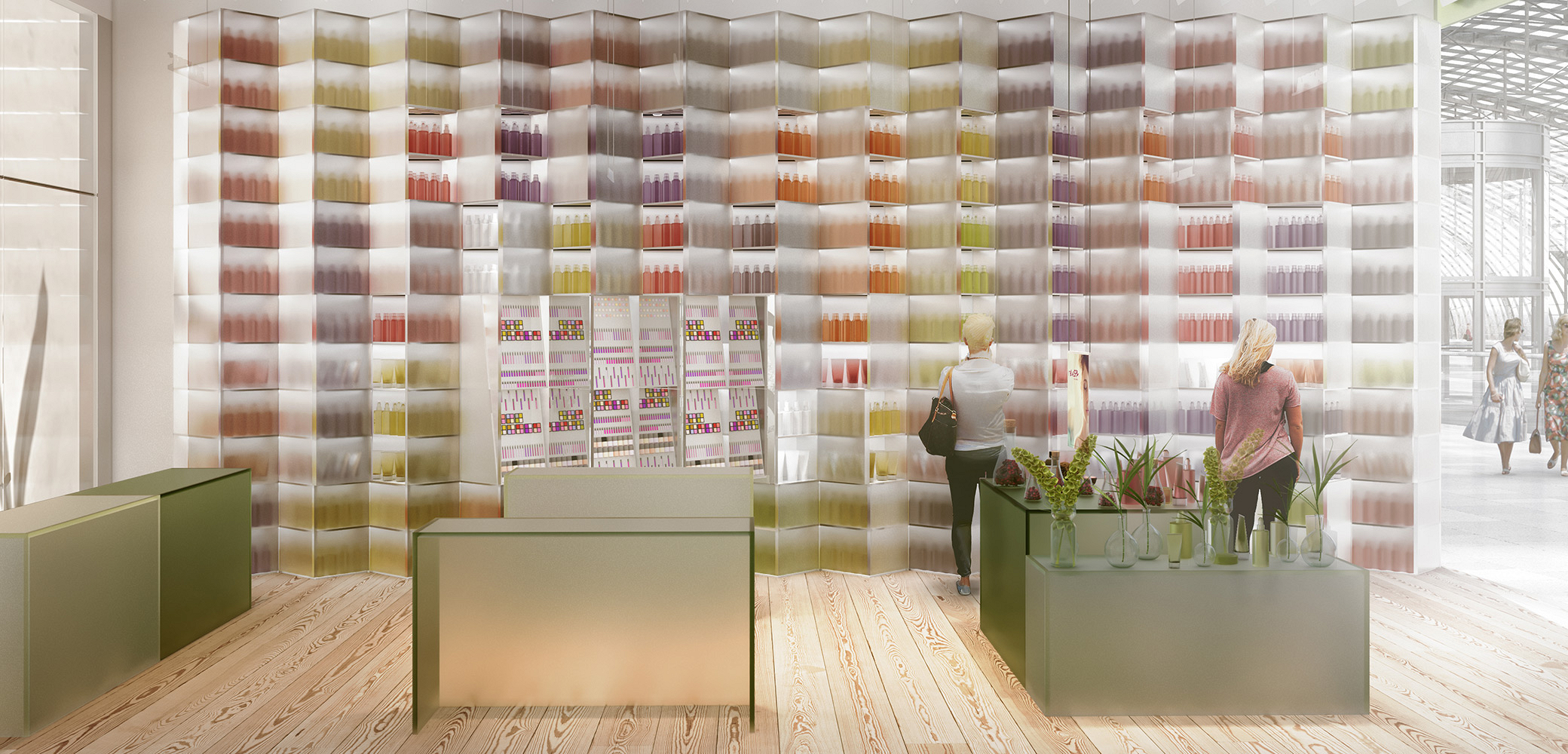 Para os expositores de produtos, partimos de um módulo mínimo de 2 x 40cm por 60cm que se repete horizontal e verticalmente, criando conjuntos que se acomodam as dimensões de cada loja. Esse princípio garante flexibilidade e adaptabilidade as montagens e a eventuais revisões do layout. As portas de material translúcido são superfícies para aplicação de visual merchandising, 100% integrado à arquitetura. Quando todos os produtos são massivamente expostos e visíveis ao mesmo tempo, sem “respiros”, fica muito mais difícil torná-los objetos de desejo. A partir do princípio de ocultamento parcial de alguns produtos (que se tornam “aquarelados” sob a superfície translucida) é possível criar respiros e campos “protegidos” onde produtos especiais exercem sua identidade e são elevados a objeto de desejo. A geometria proposta para os expositores laterais, como uma dobradura, modula verticalmente a leitura de seu conteúdo e assim sugere a setorização de categorias e heroes. Ao mesmo tempo, o sistema construtivo modular proporciona um jogo de nichos abertos e fechados, que torna a experiencia mais aberta, dinâmica e convidativa. A angulação em zig-zag favorece a visão dos produtos de fora da loja, sem as obstruções visuais comuns em prateleiras paralelas a parede. Assim como os expositores verticais, as mesas das novas lojas também compõem um sistema. Para otimização do espaço, os diferentes tamanhos são definidos para que uma mesa se encaixe sob a outra. A variedade de possibilidades de montagem das mesas centrais permite mais mobilidade entre os espaços da loja e desperta o interesse do público para a experiência, seja por meio da elaboração de cenários para campanhas, linhas de produtos, ou montagem de espaços para testes e exposições de fragrâncias.