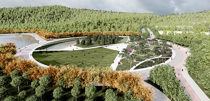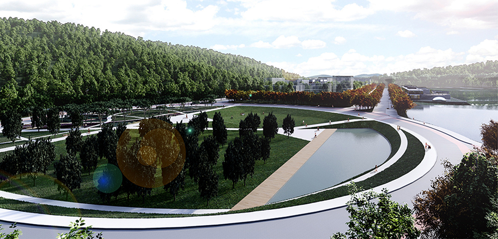 No que diz respeito ao paisagismo, pretende-se proporcionar a interação entre a paisagem local e as áreas urbanizadas do Parque, marcadas principalmente pela nova represa. A arborização das ruas do loteamento é temática, isto é, cada rua correspondendo a uma determinada espécie arbórea nativa. São utilizadas espécies perenes que demandam menor quantidade de água na irrigação, capazes de promover um paisagismo sustentável e com economia de manutenção. A ênfase do desenho paisagístico é dada à Ágora, que funciona como articuladora do Parque e terá espaços para eventos, contemplação e lazer. Além disso, a inserção de vários equipamentos que priorizam o bem-estar dos usuários (bancos, mesas, vasos, iluminação) valoriza as calçadas e a Ágora.