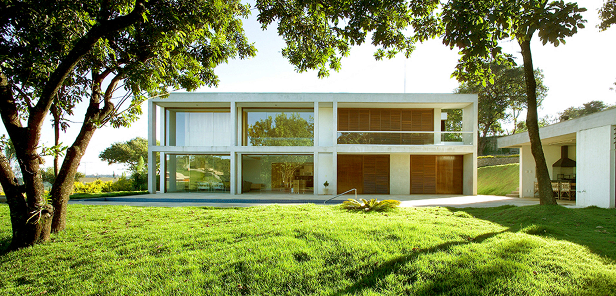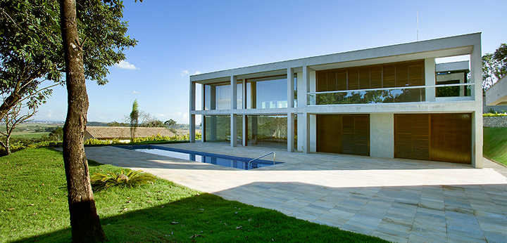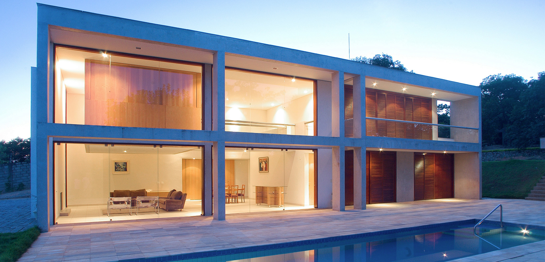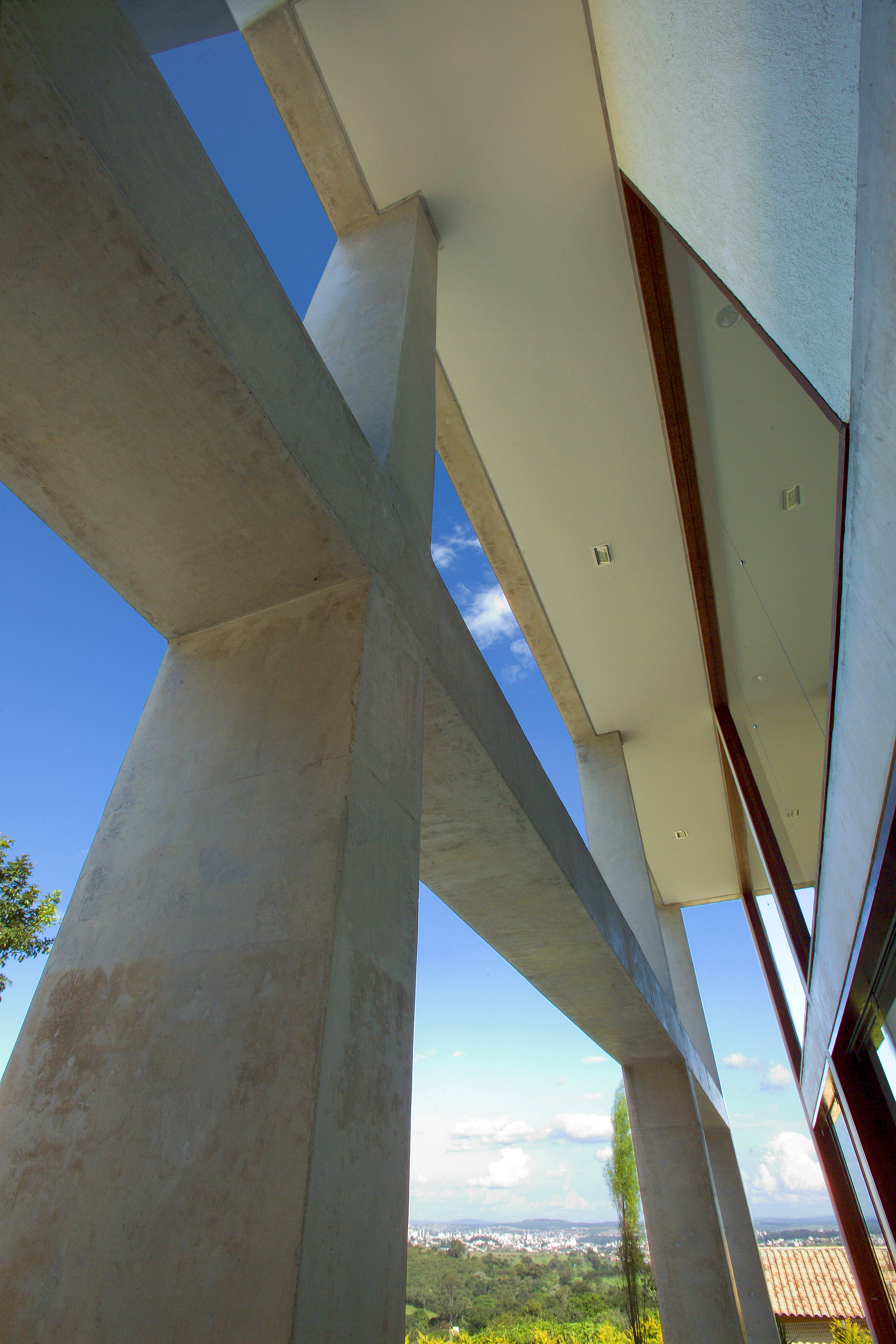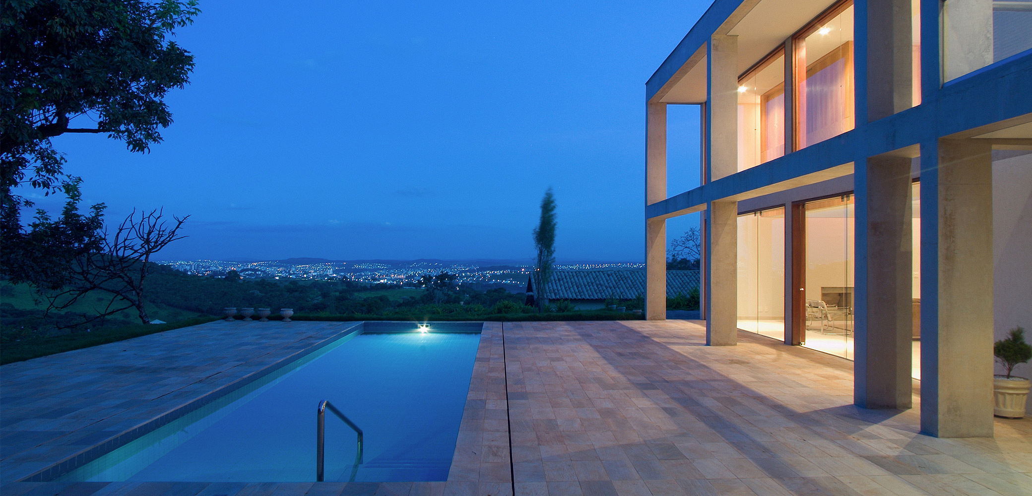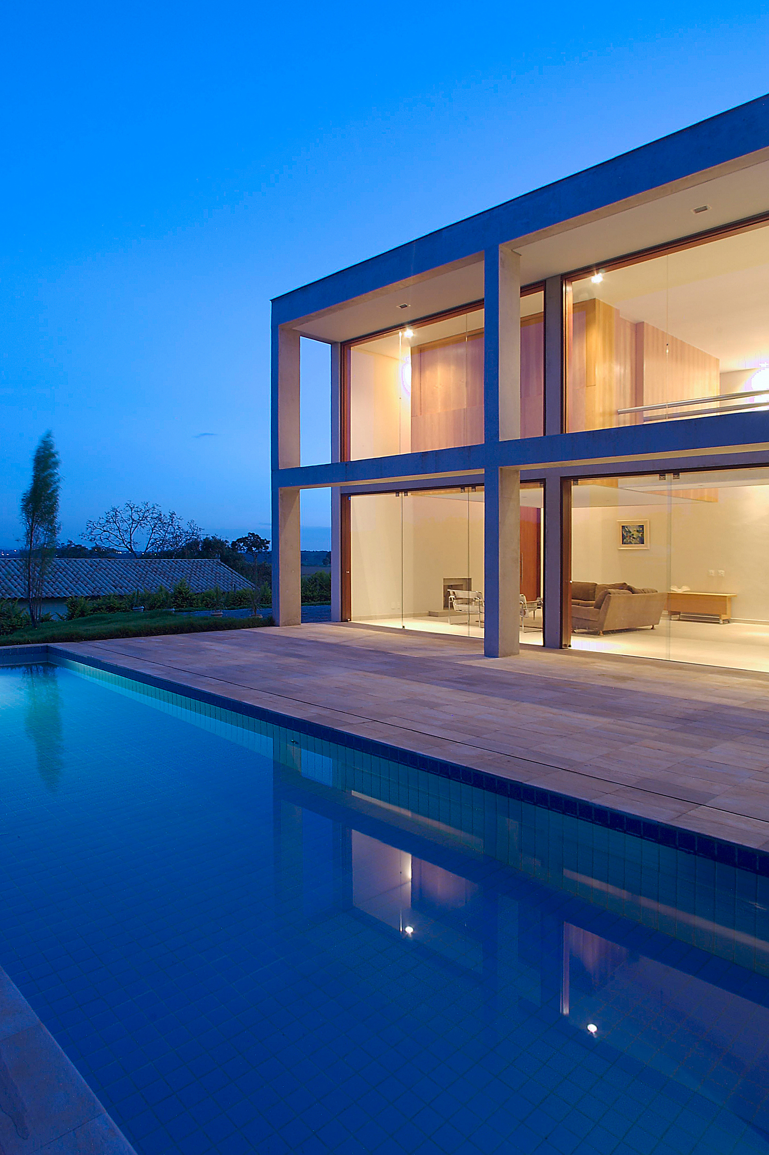 As áreas social e íntima são tratadas de forma diferenciada no volume prismático da casa. A área social possui a altura total do prisma, transparência e seus elementos de vedação – porta de entrada e panos de vidro – explicitam a volumetria interna. A área íntima, mais fechada e reservada, subdividide a altura do prisma em dois pavimentos_ o andar superior é ocupado pelo quarto do casal e o pavimento térreo pelas filhas, escritório e eventuais hóspedes.