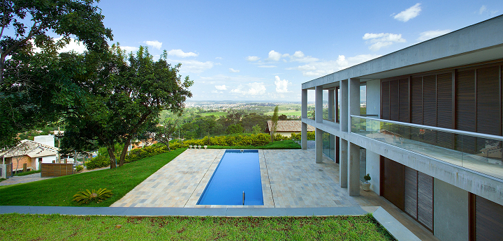 A área recreativa é formada por uma edícula semi-enterrada, com churrasqueira, vestiário e sauna e a área da piscina. O teto gramado da edícula forma um mirante que tem a piscina, comprida e estreita, apontando a paisagem.