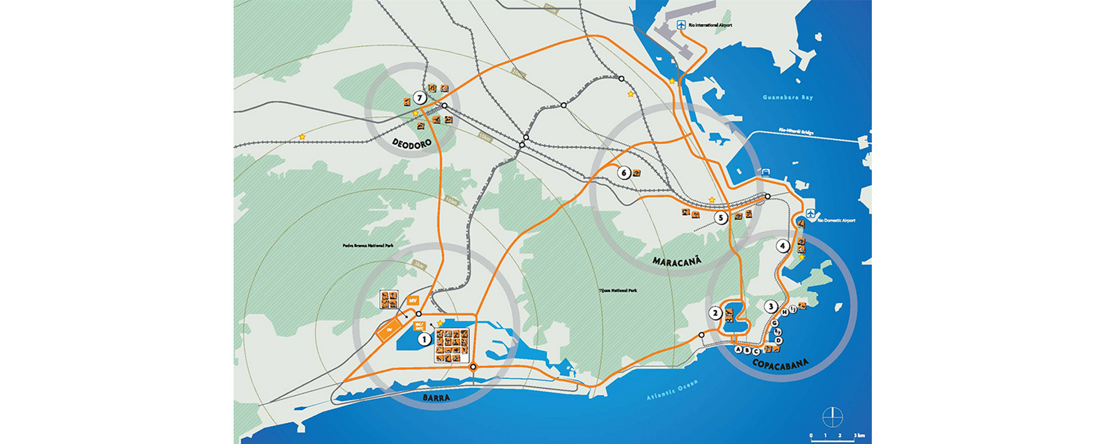 As instalações para as Olimpíadas de 2016 foram agrupadas em quatro grandes zonas distintas da cidade: Barra, Copacabana, Maracanã e Deodoro, “clusters” que seriam ligados por um eficiente sistema de transporte viário e de trens de alta performance. Essa estratégia teve como objetivo distribuir os benefícios diretos e indiretos dos jogos entre todos os habitantes do Rio de Janeiro, por meio da construção de instalações e melhorias baseadas em uma rede de infraestrutura já existente.