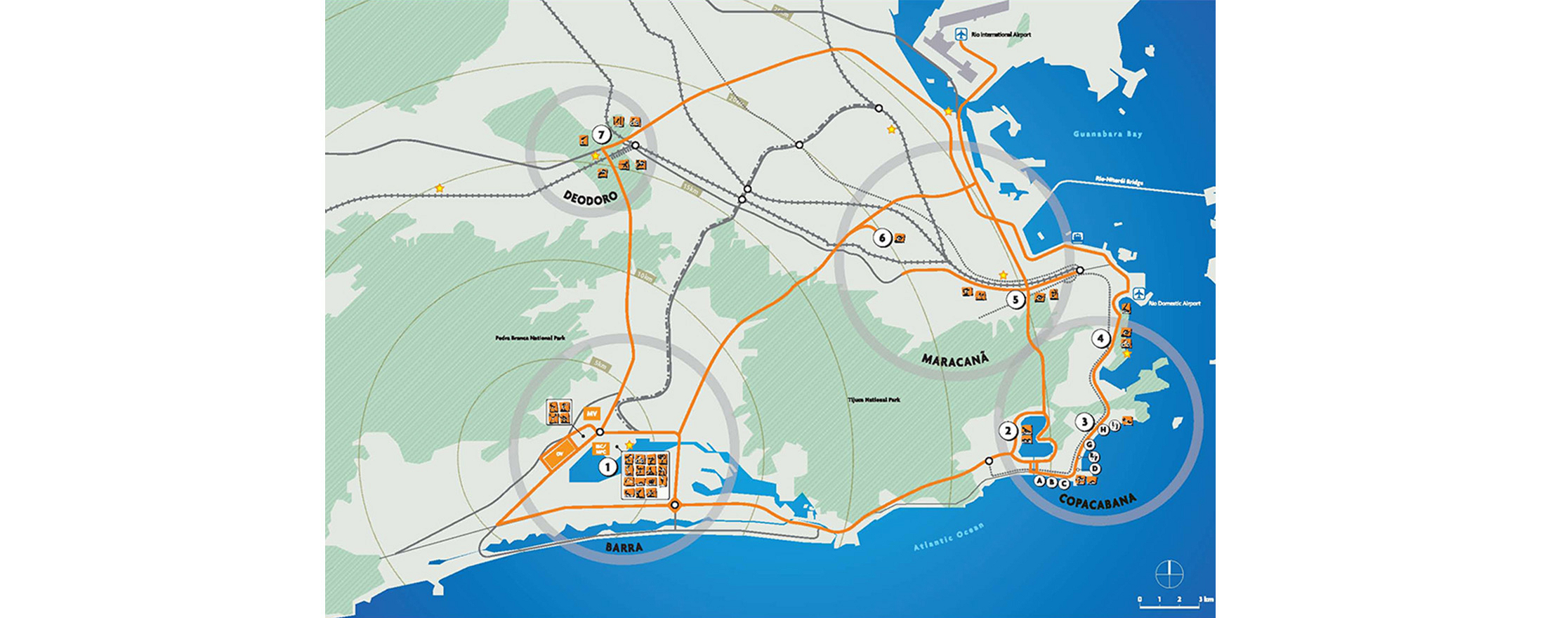 As instalações para as Olimpíadas de 2016 foram agrupadas em quatro grandes zonas distintas da cidade: Barra, Copacabana, Maracanã e Deodoro, “clusters” que seriam ligados por um eficiente sistema de transporte viário e de trens de alta performance. Essa estratégia teve como objetivo distribuir os benefícios diretos e indiretos dos jogos entre todos os habitantes do Rio de Janeiro, por meio da construção de instalações e melhorias baseadas em uma rede de infraestrutura já existente.