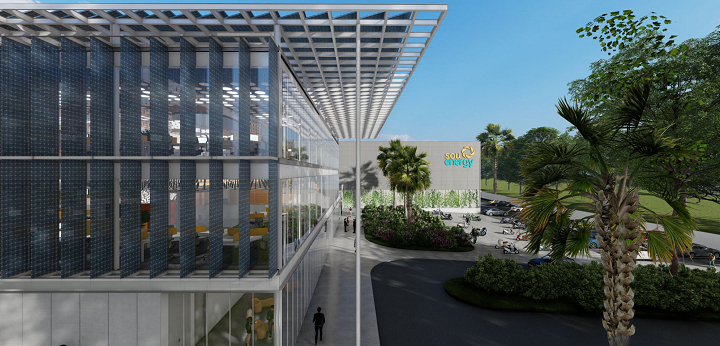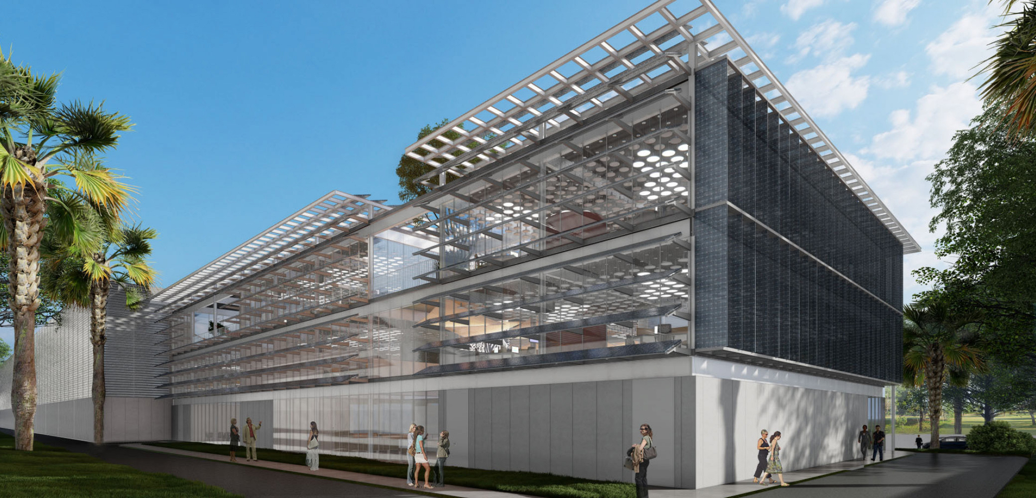 Na fachada, grandes panos de vidro totalmente transparentes permitem a integração do espaço interno com o espaço externo. Esses são seguidos por painéis solares modulados que funcionam como uma segunda pele de brise-soleil para proteção das superfícies que recebem maior insolação. Referido recurso de controle da iluminação natural, associado às aberturas estratégicas de pátios, terraços e pés-direitos duplos no miolo da edificação, permitem uma otimização do uso ar-condicionado e da iluminação artificial, tornando a construção mais eficiente do ponto de vista de conforto ambiental, e sustentável do ponto de vista de consumo de energia.