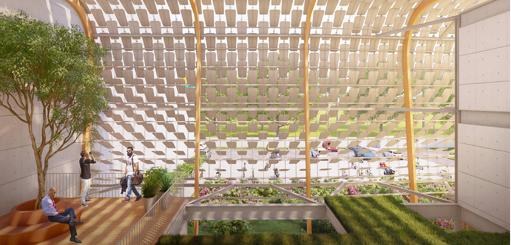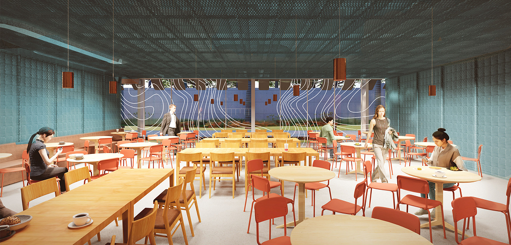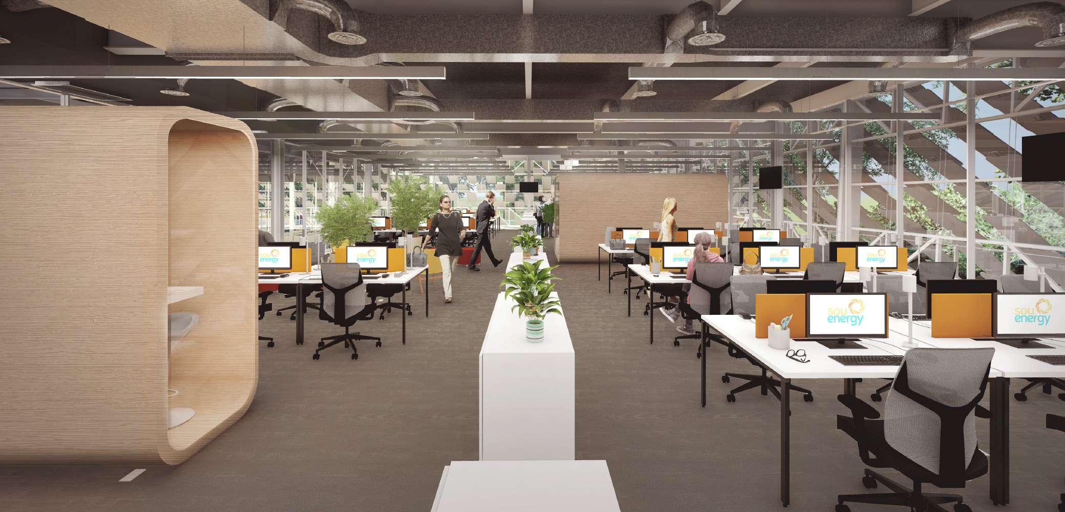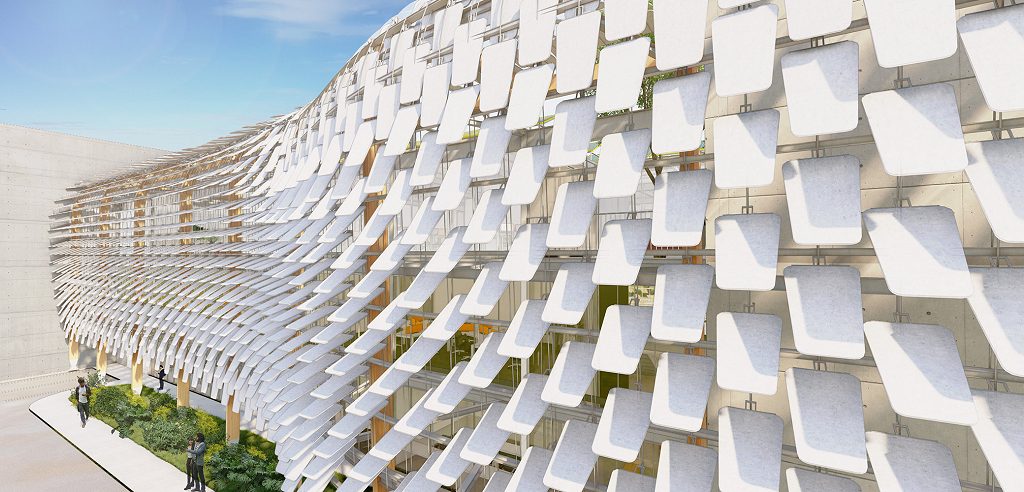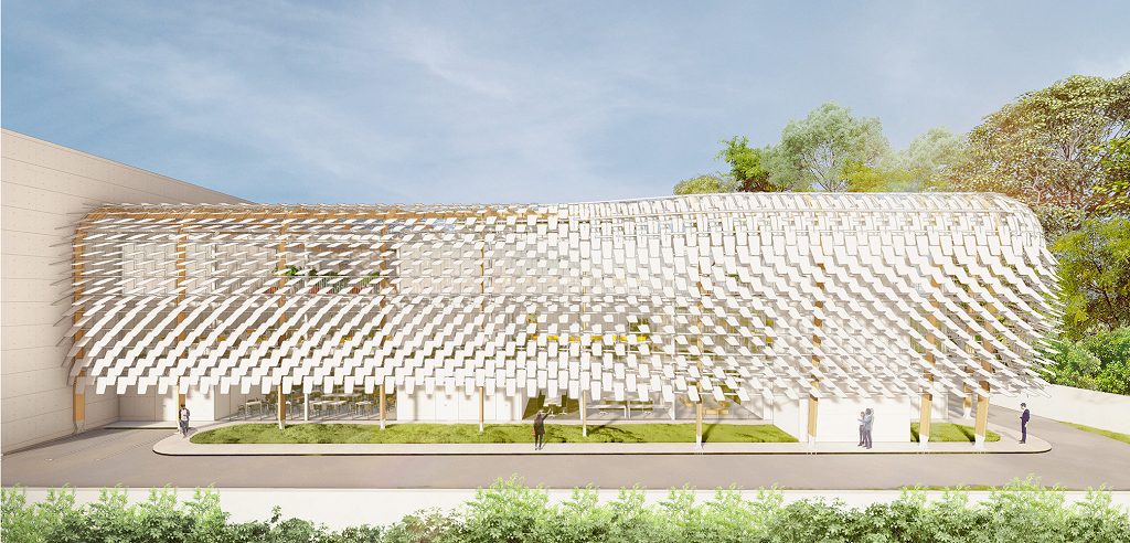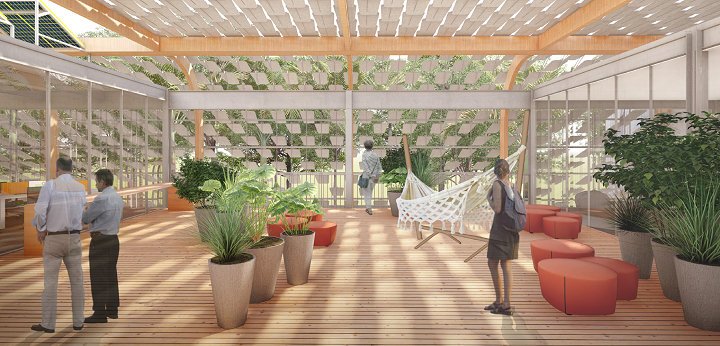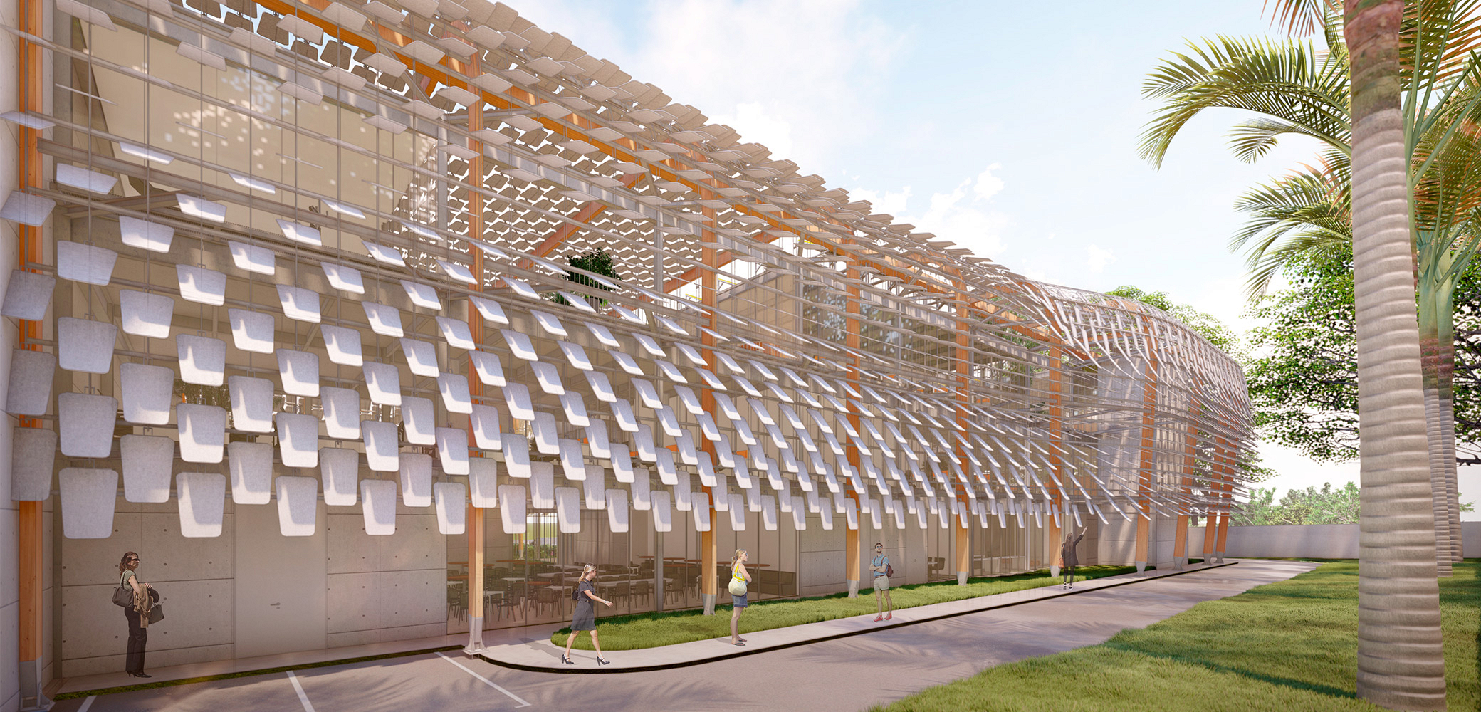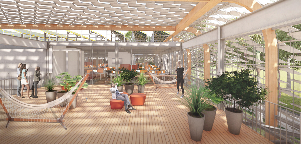Pretende-se fazer do escritório um ambiente integrado, inspirado nas novas tendências de espaço de trabalho – flexibilidade, áreas de descompressão, horizontalidade, conforto e informalidade – mas também estampar marcos da cultura local e da própria empresa a partir do tratamento paisagístico, da utilização de texturas, cores e referências artístico-culturais em suas superfícies. Na fachada, grandes panos de vidro totalmente transparentes permitem a integração do espaço interno com o espaço externo. Esses são seguidos por painéis solares modulados que funcionam como uma segunda pele de brise-soleil para proteção das superfícies que recebem maior insolação. Referido recurso de controle da iluminação natural, associado às aberturas estratégicas de pátios, terraços e pés-direitos duplos no miolo da edificação, permitem uma otimização do uso ar-condicionado e da iluminação artificial, tornando a construção mais eficiente do ponto de vista de conforto ambiental, e sustentável do ponto de vista de consumo de energia.